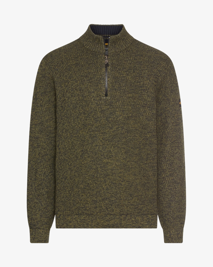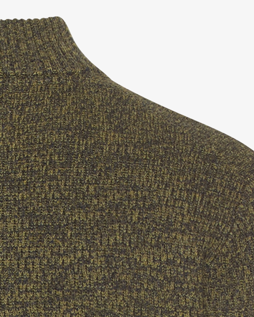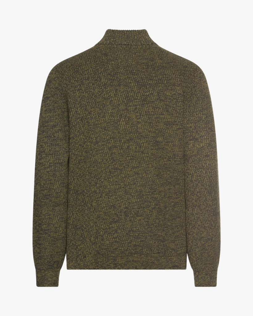 Kraftig strik med half-zip og meleret struktur. Trøjen har høj ribkrave, regular fit og er strikket i en slidstærk bomuldsblanding. Et varmt og praktisk lag til efterår og vinter.