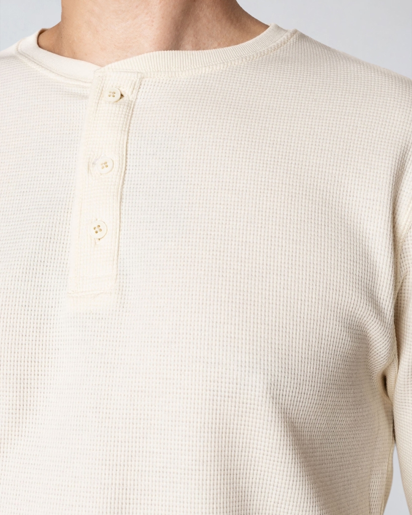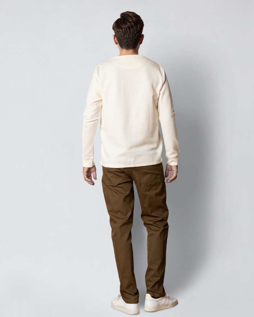 En tidløs langærmet grandad T-shirt med alle de klassiske detaljer. Den har knaplukning ved halsen, tekstureret materiale og en rund halsudskæring – en komfortabel og stilren tilføjelse til hverdagsgarderoben.