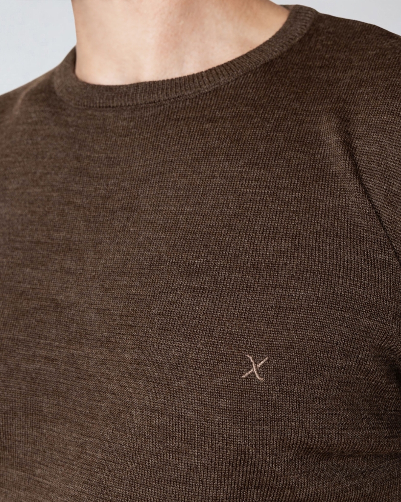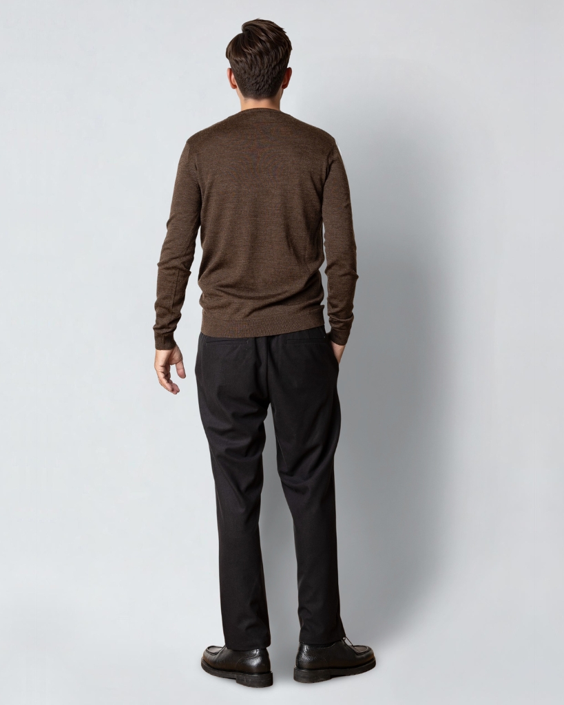 Varm og raffineret striktrøje i en smuk brun nuance. Udført i en blød og slidstærk merinoblanding, som giver både komfort og et eksklusivt udtryk. Perfekt til lag-på-lag eller alene over skjorte.