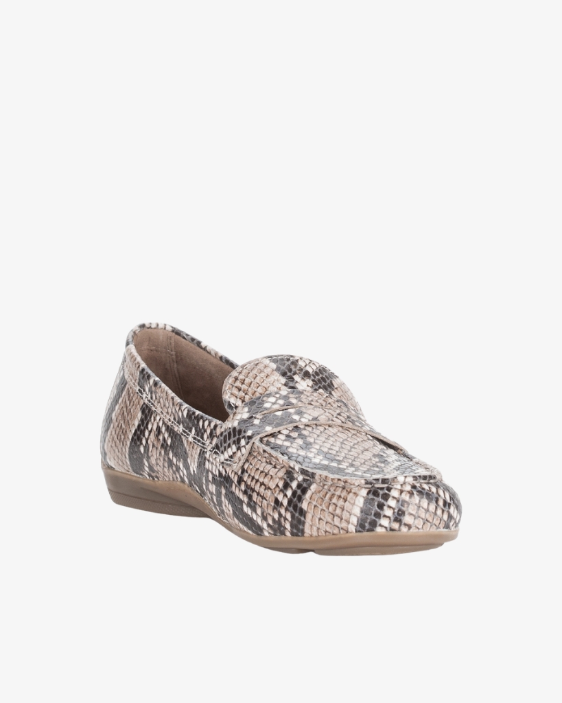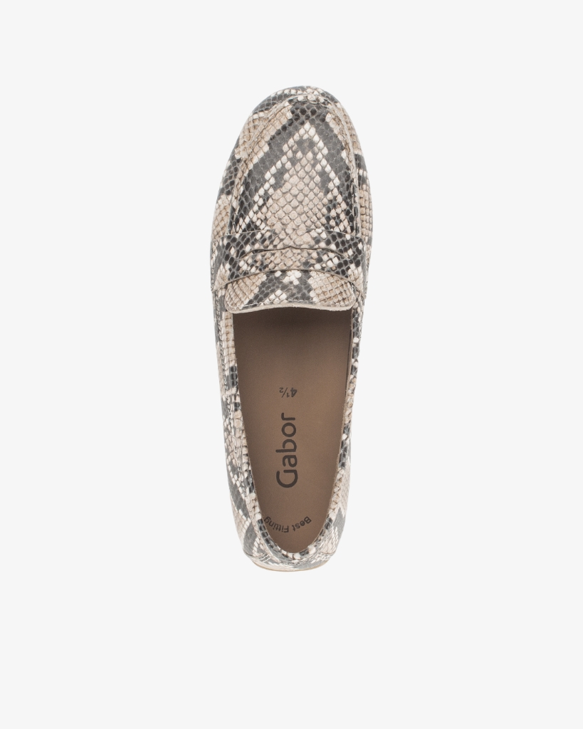 En klassisk loafer fra Gabor med elegant slangeskindsprint, der giver skoen et eksklusivt udtryk. Den lette og fleksible gummisål samt den bløde indersål giver høj komfort gennem hele dagen. Modellen er lavet med Gabors Best Fitting, som giver ekstra plads i forfoden og dermed en mere behagelig pasform.