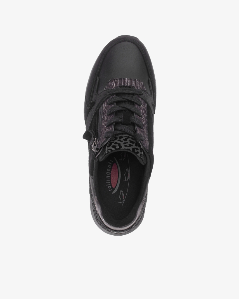 Sort ruskindssko med snøre og lynlås – let at tage på. Fine detaljer i skind og grå leo bagpå giver et diskret spil i designet. Udtagelig Optifit indersål og Comfort vidde G sikrer god plads og støtte til forfoden. Kilehæl på 1,5 cm.