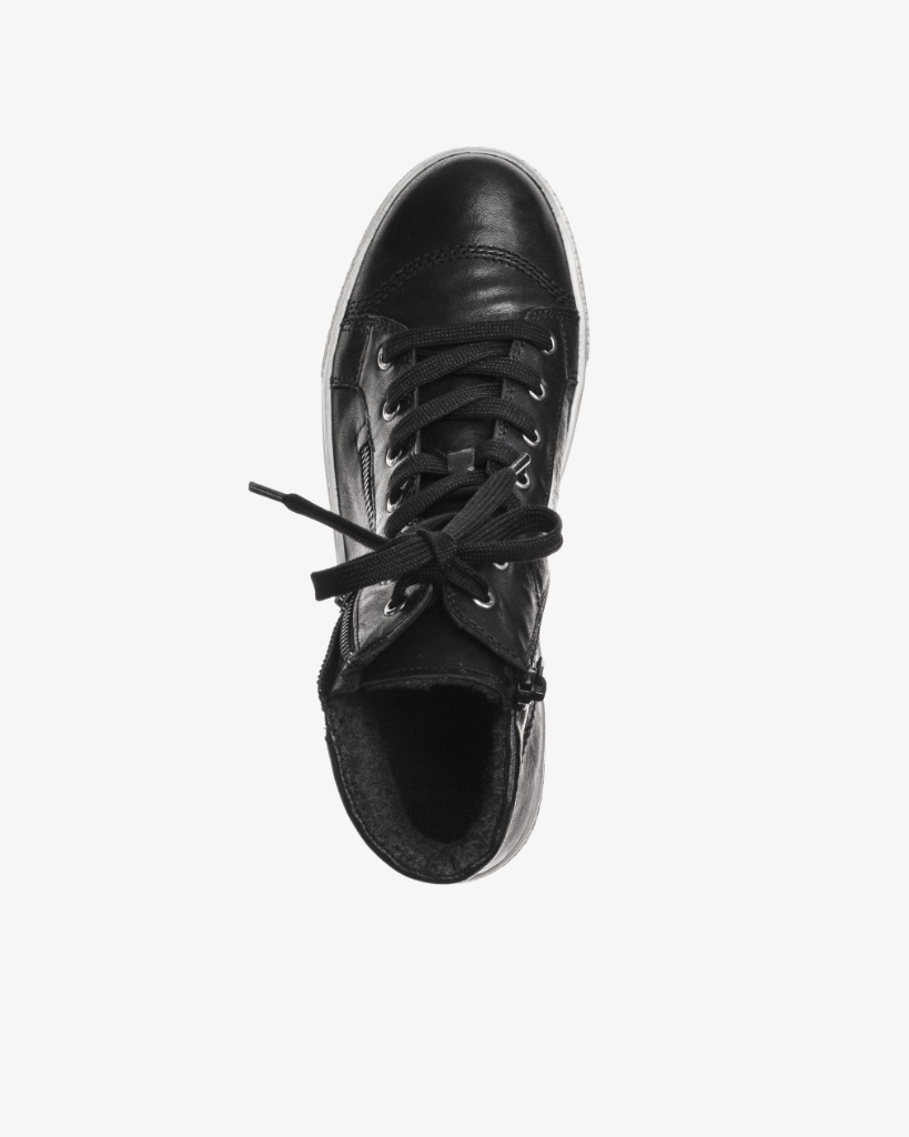 Klassisk efterårs-/vinter-sneaker i sort skind med skaftelængde på 12 cm. Den har varmt melangefoer, snøre for god tilpasning og lynlås i siden for nem af- og påtagning. Med udtagelig Optifit indersål og blød gummikile på 7 mm for ekstra komfort.