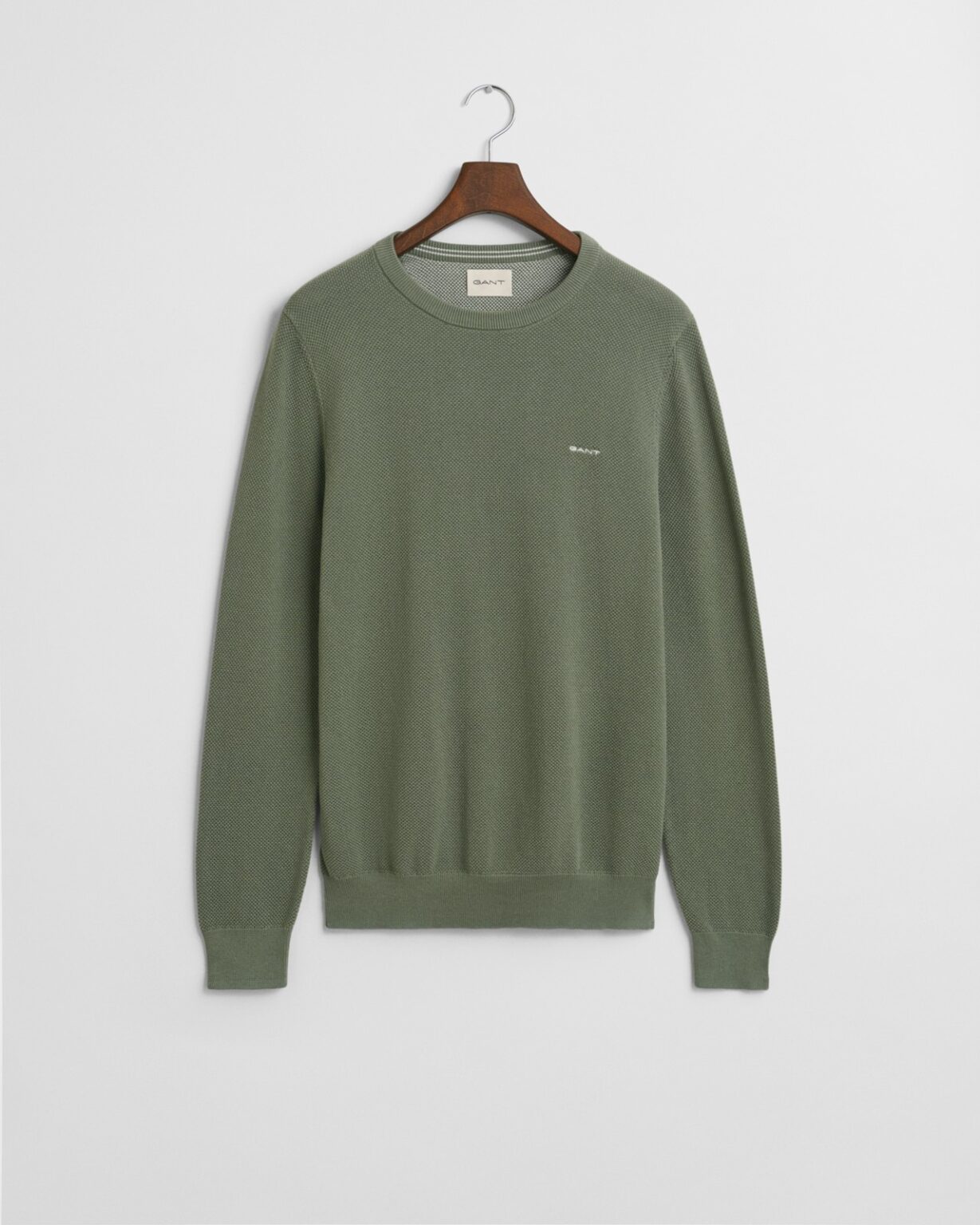 Let og alsidig striktrøje i en fin piqué-struktur. Designet med rund hals, ribkanter og et diskret broderet GANT-logo på brystet.