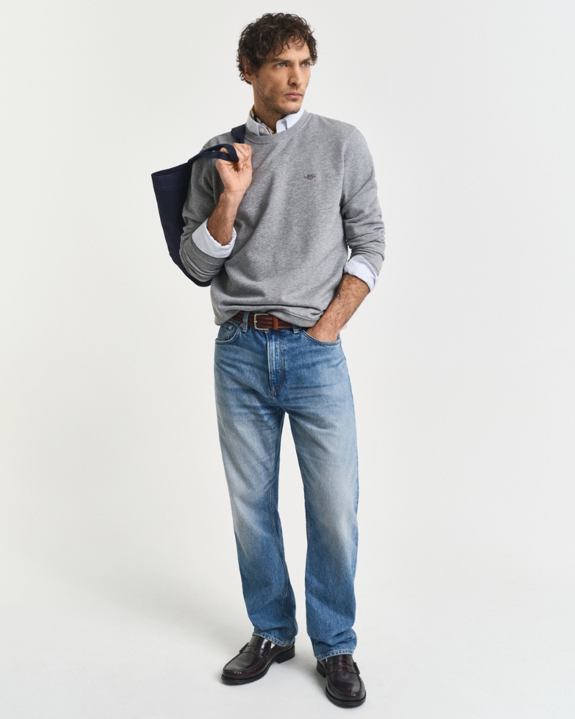 Klassisk sweatshirt i meleret grå med rund hals og broderet GANT-logo på brystet. Fremstillet i en blød bomuldsblanding med ribkanter, der giver en god pasform og et afslappet udtryk.