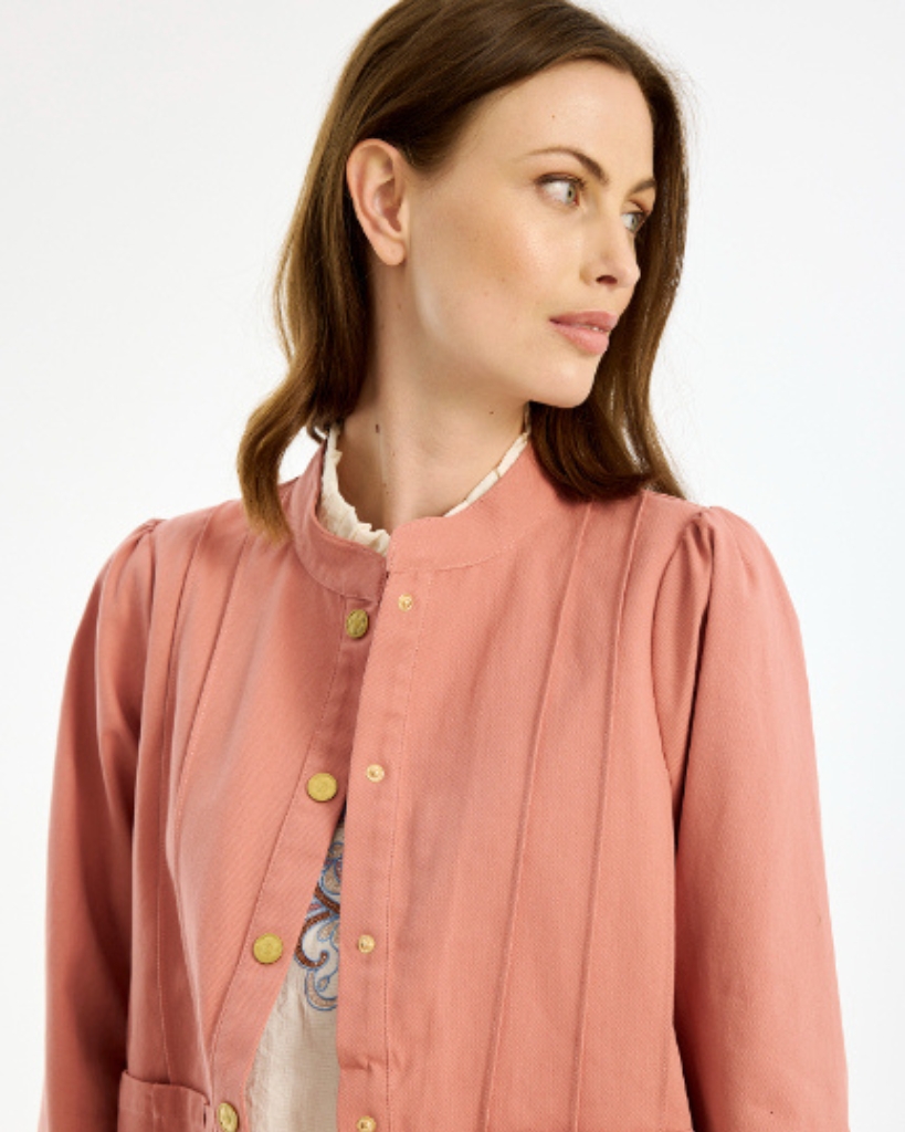 Gør plads i garderoben til denne elegante og feminine jakke med ståkrave og fine læg foran og bagpå. De gyldne knapper og de diskrete pufærmer giver et sofistikeret udtryk, mens de rummelige lommer gør den praktisk i hverdagen.