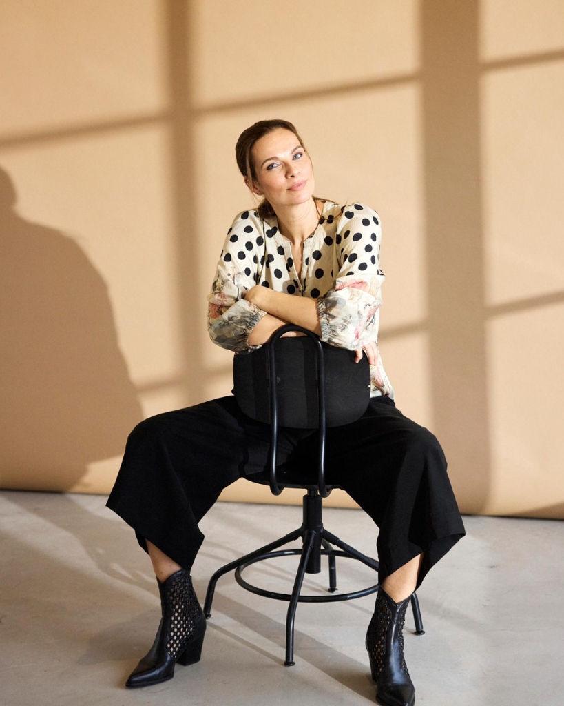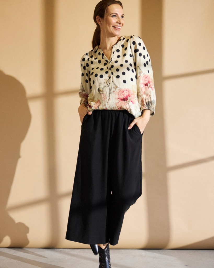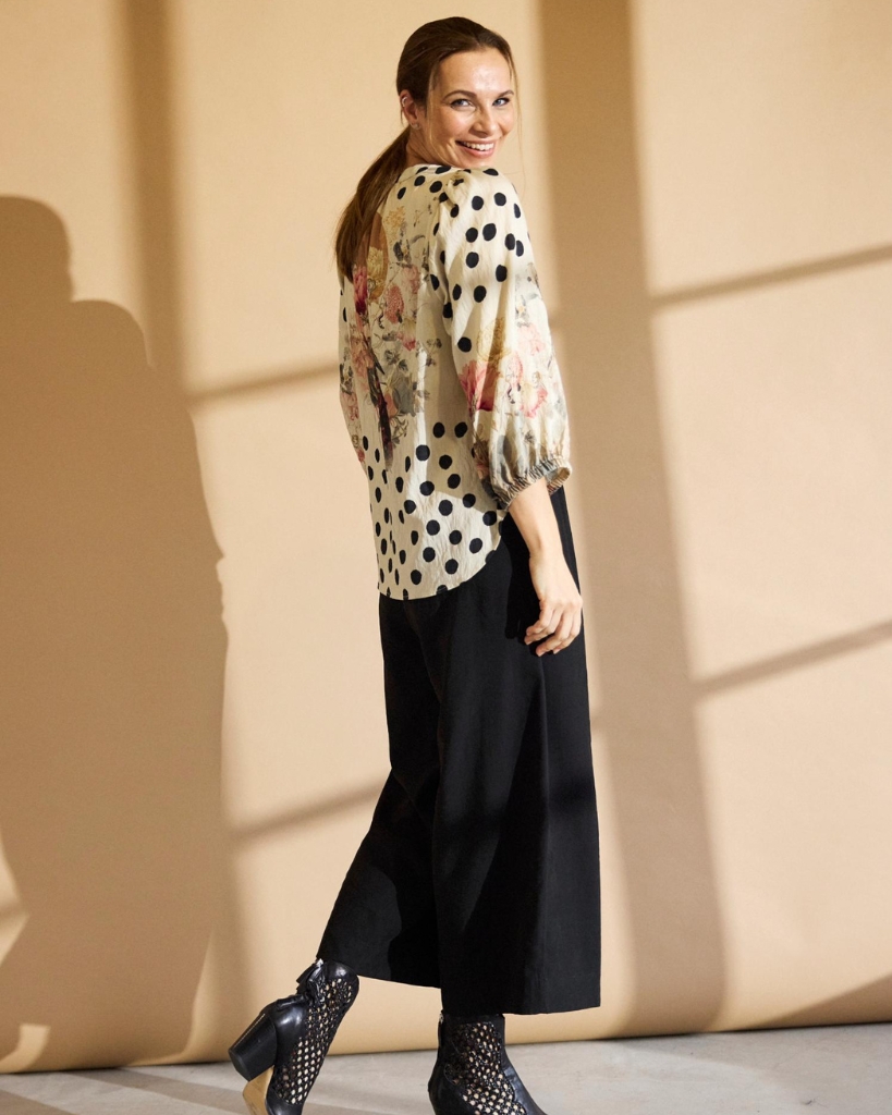 Gør plads til farver og fantasi med denne unikke bluse. Den kombinerer sorte prikker med floralt print og et elegant fuglemotiv på ryggen – alt sammen på en let og luftig kvalitet. En stilfuld statement-bluse, der skiller sig ud med ynde.