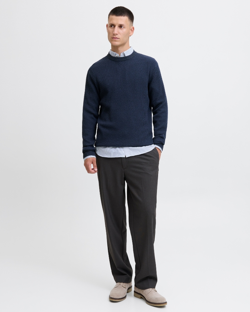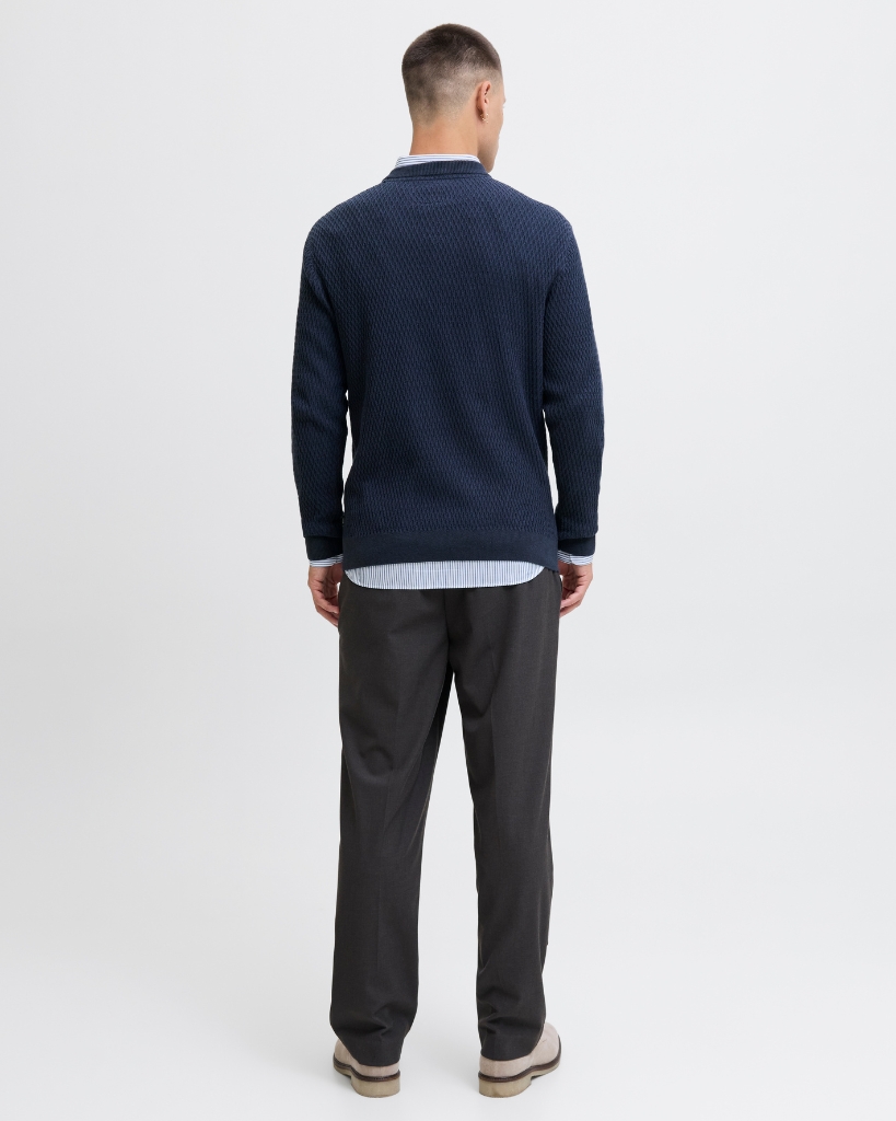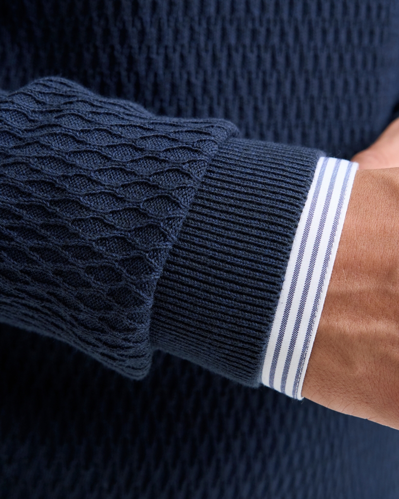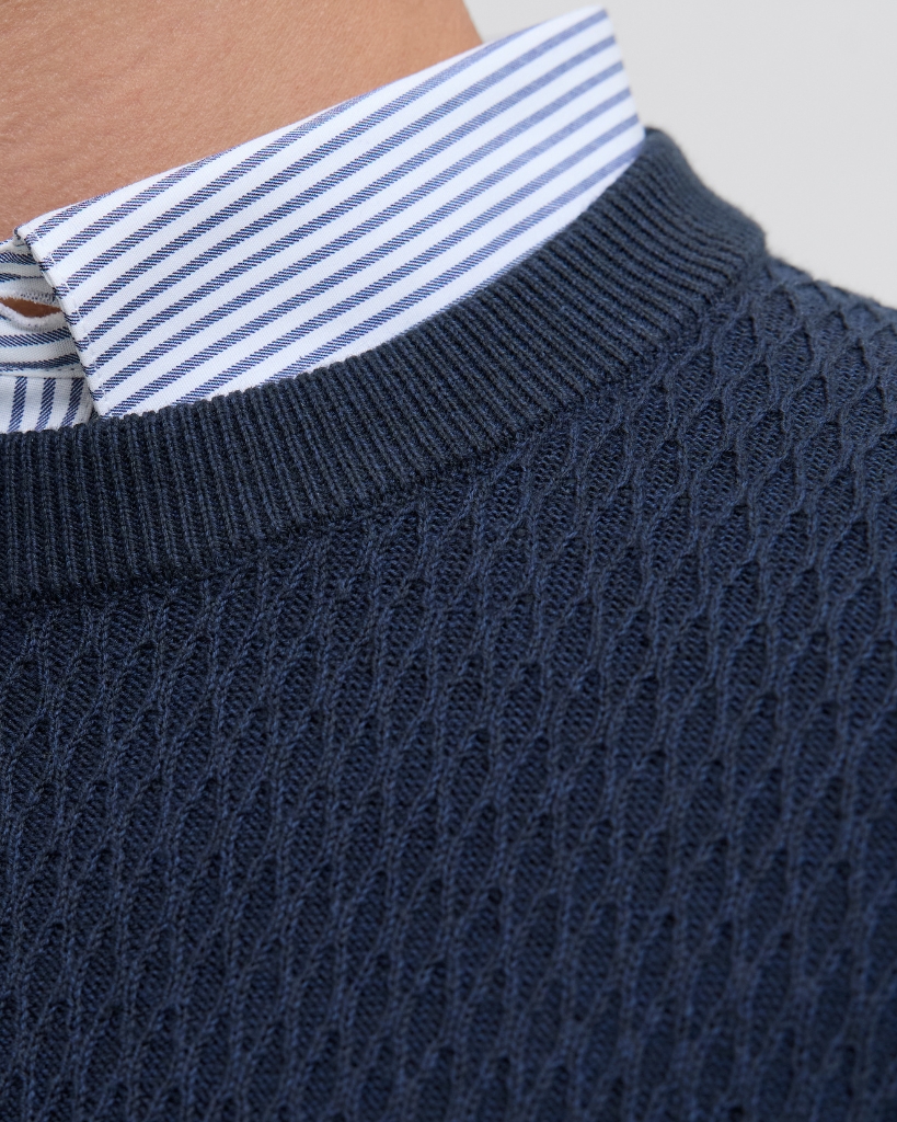 Tidløs navy striktrøje i blød bomuld med elegant struktur. Den flade strikketeknik sikrer en behagelig pasform og god bevægelighed. Farven dark navy giver et stilrent og anvendeligt udtryk, der passer til det meste i garderoben.