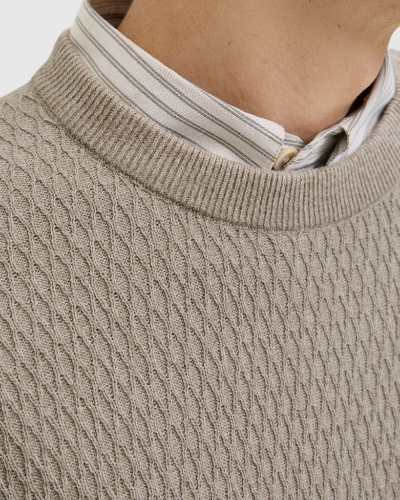 Blød striktrøje i den elegante og neutrale farve greige – en blanding af grå og beige, der passer til alt. Den flade strikketeknik og strukturen i overfladen giver både komfort og karakter. En alsidig trøje med klassisk rund hals.