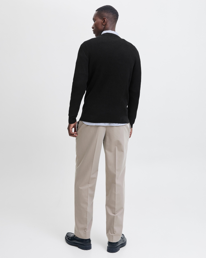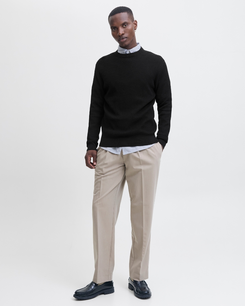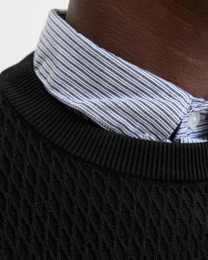 Klassisk sort striktrøje med diskret struktur og rund hals. Trøjen er strikket i blød bomuld med en flad strikketeknik, som giver fleksibilitet og en behagelig pasform. Et sikkert valg til både hverdag og lag-på-lag stil.