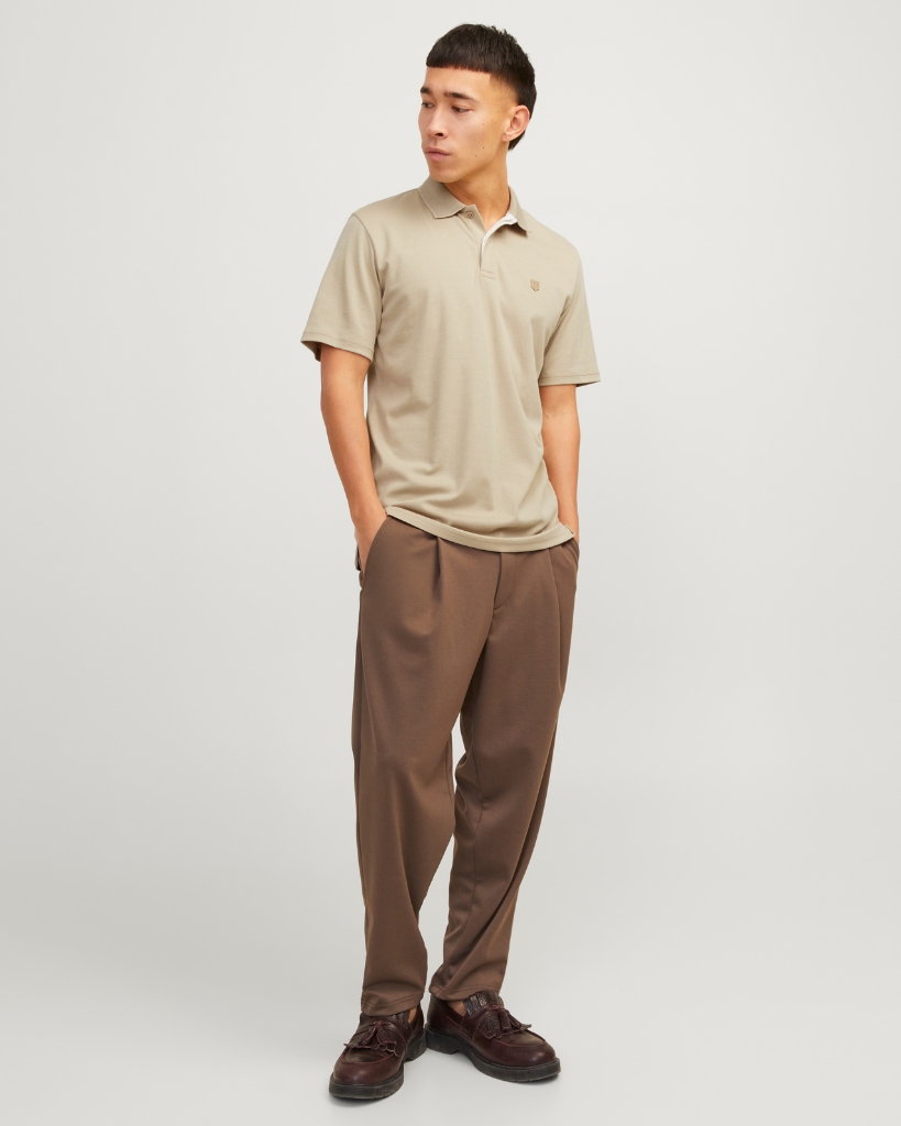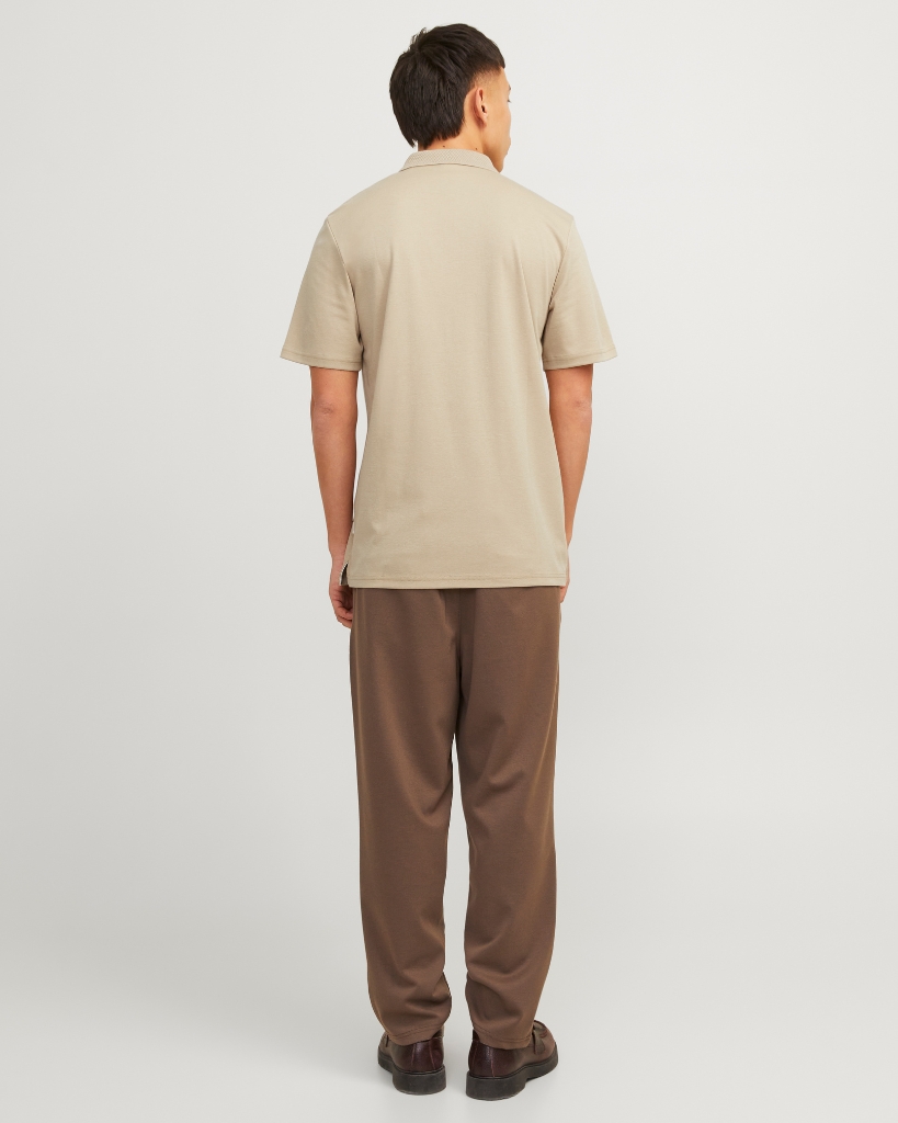 Klassisk polo i en flot, lys beige nuance med diskret logo-badge på brystet. Fremstillet i en blød og komfortabel jerseykvalitet, der kombinerer bomuld og genanvendt polyester. Den har kort ærme, stolpelukning og en krave med let struktur.