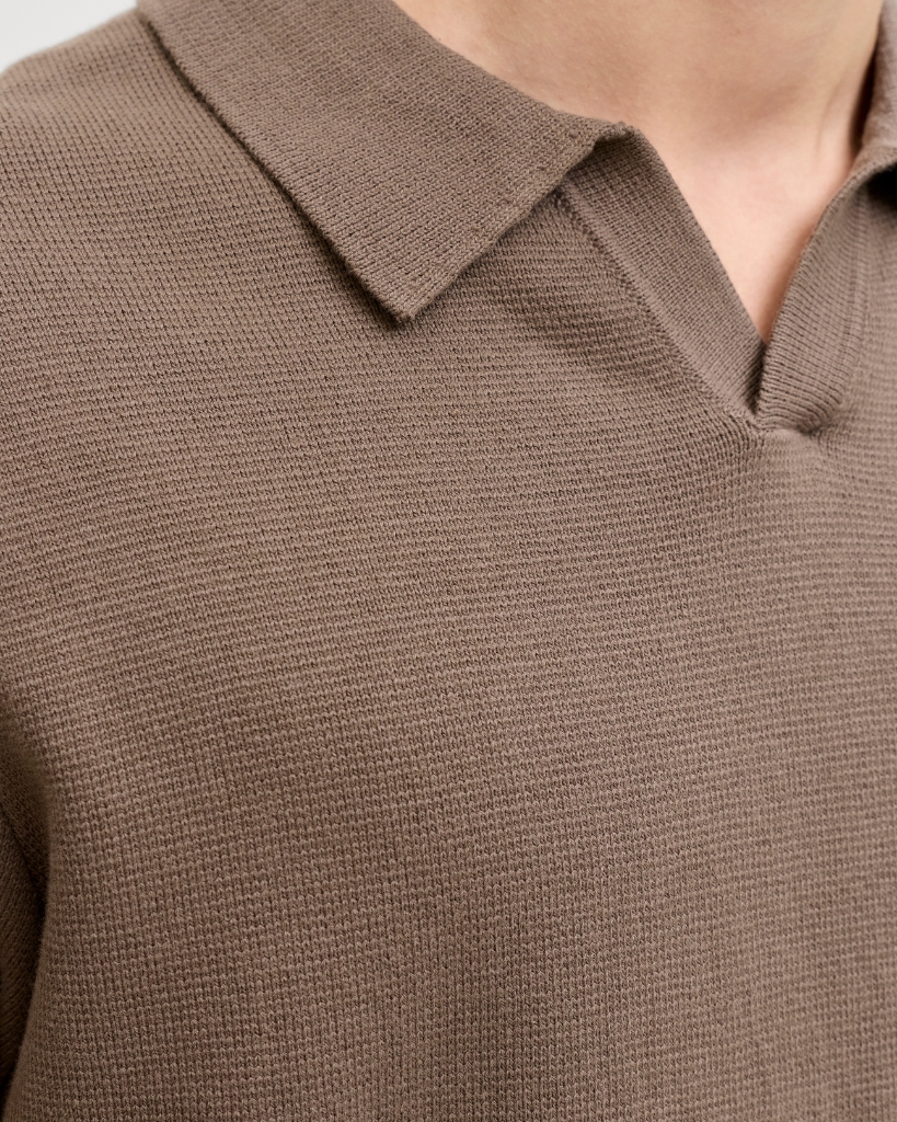 En strikket polo i en varm brunlig nuance, der kombinerer komfort med et stilrent udtryk. Den bløde strukturstrik og åbne splitkrave giver et afslappet look med et raffineret touch.
