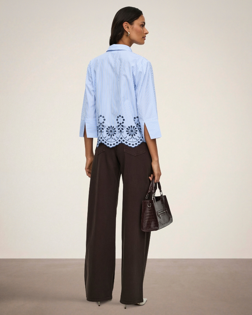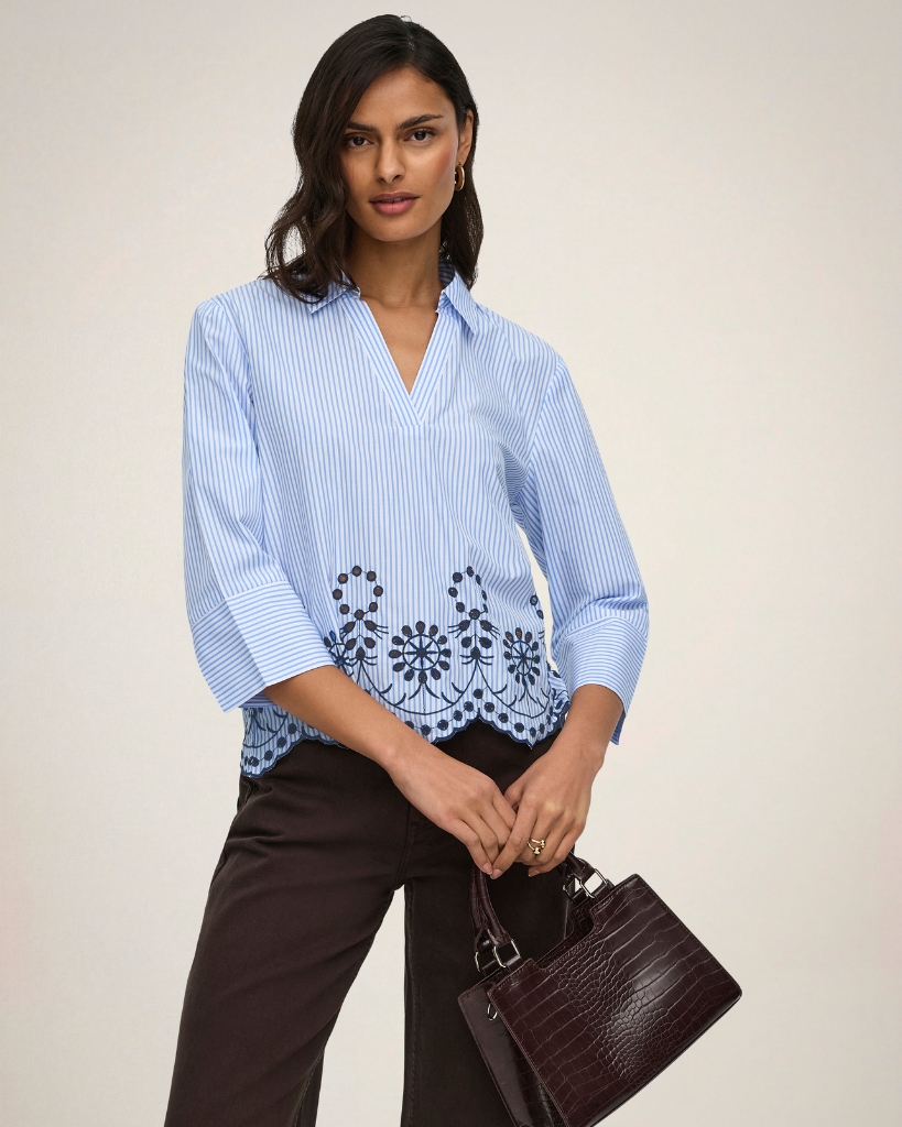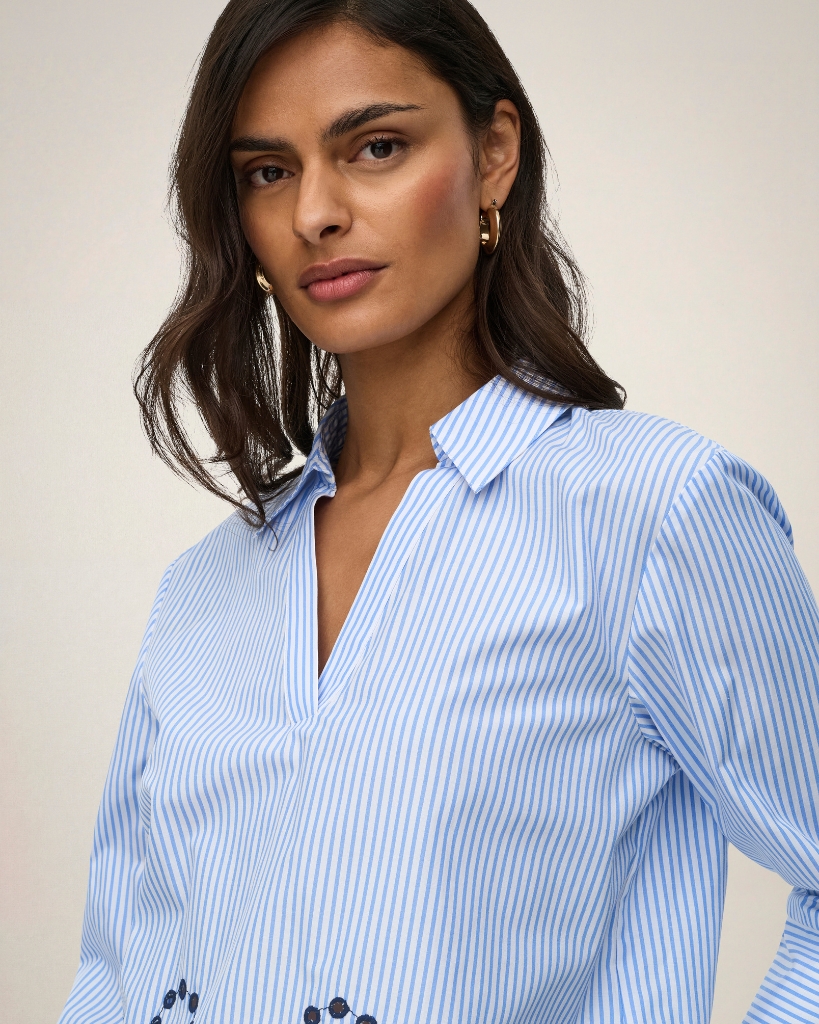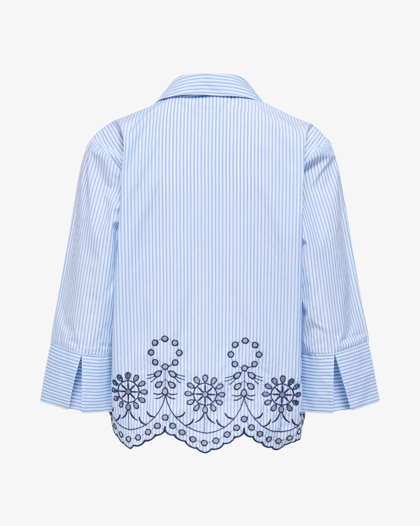 Denne stribede top fra JDY kombinerer et klassisk udtryk med fine detaljer. Den åbne V-hals og kraven giver et afslappet look, mens broderingen langs kanten skaber en flot afslutning. En let kvalitet med behagelig pasform. Er lille i størrelsen.