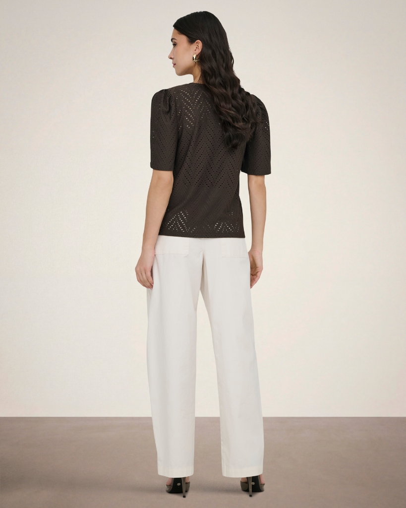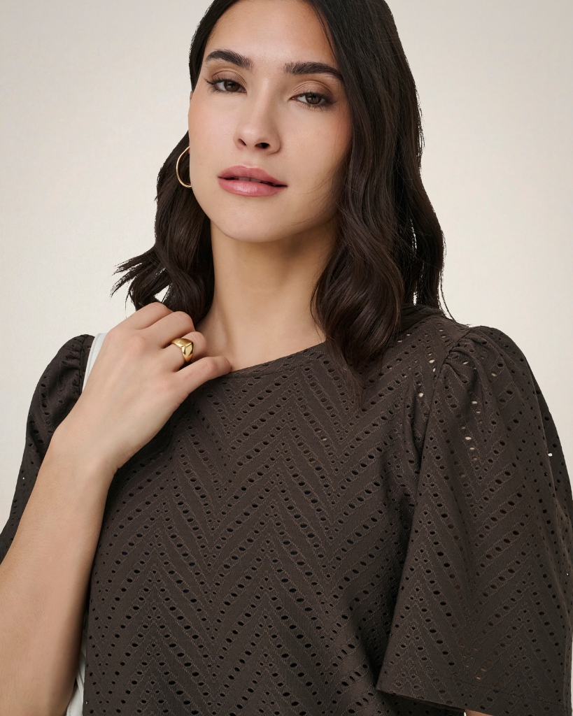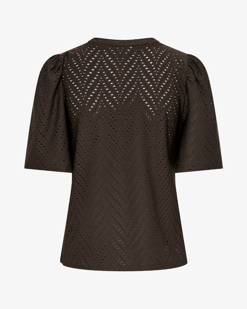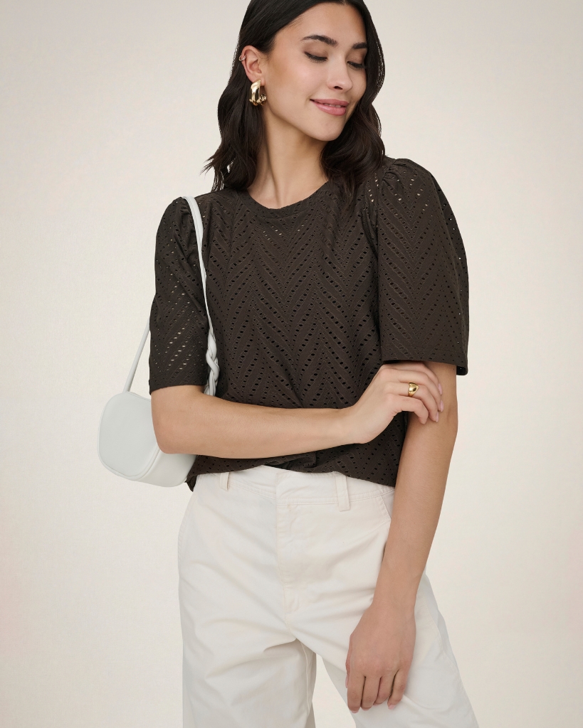 En feminin bluse i smuk broderie anglaise, der giver et let og elegant udtryk. Den fine struktur med små udskæringer tilfører et eksklusivt look, mens de lette ærmer skaber en blød silhuet. En stilren bluse med fokus på detaljer og komfort.