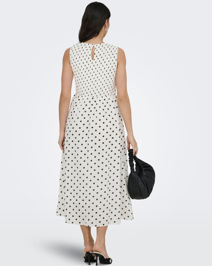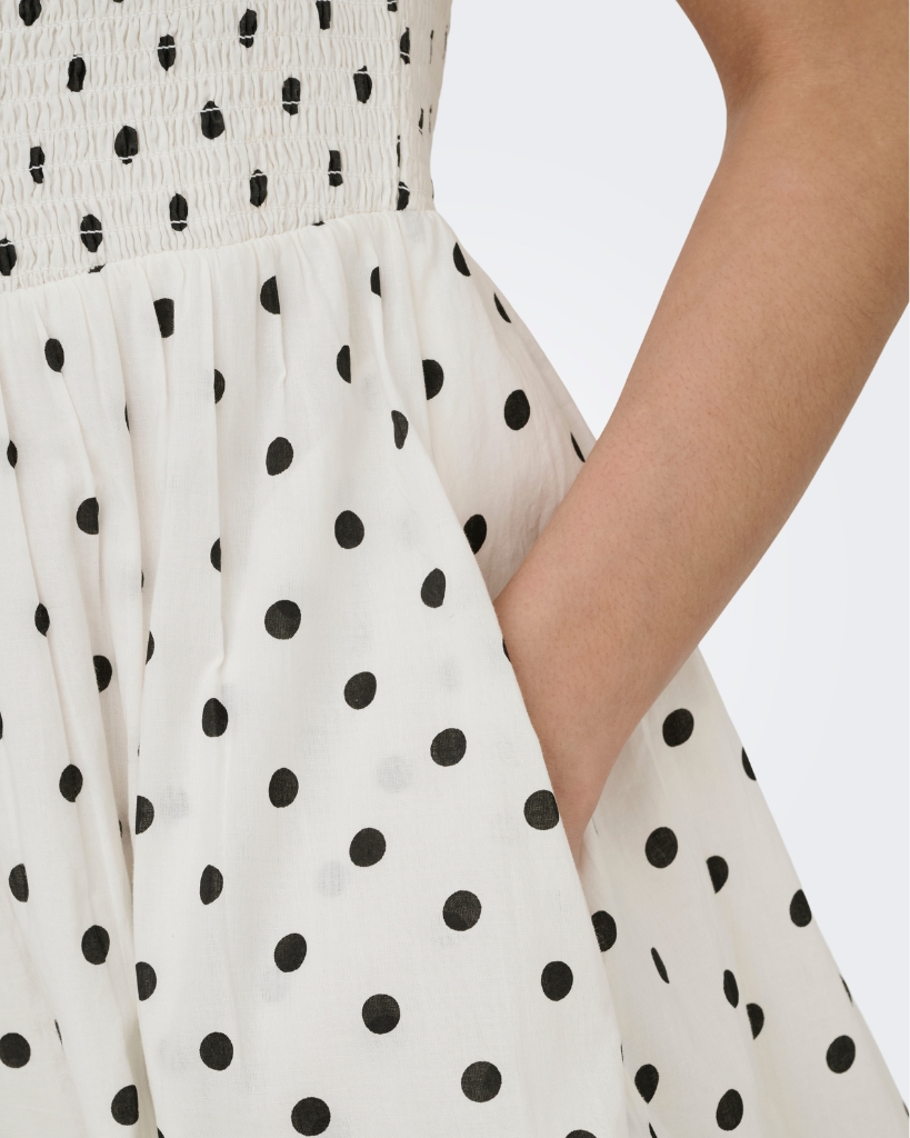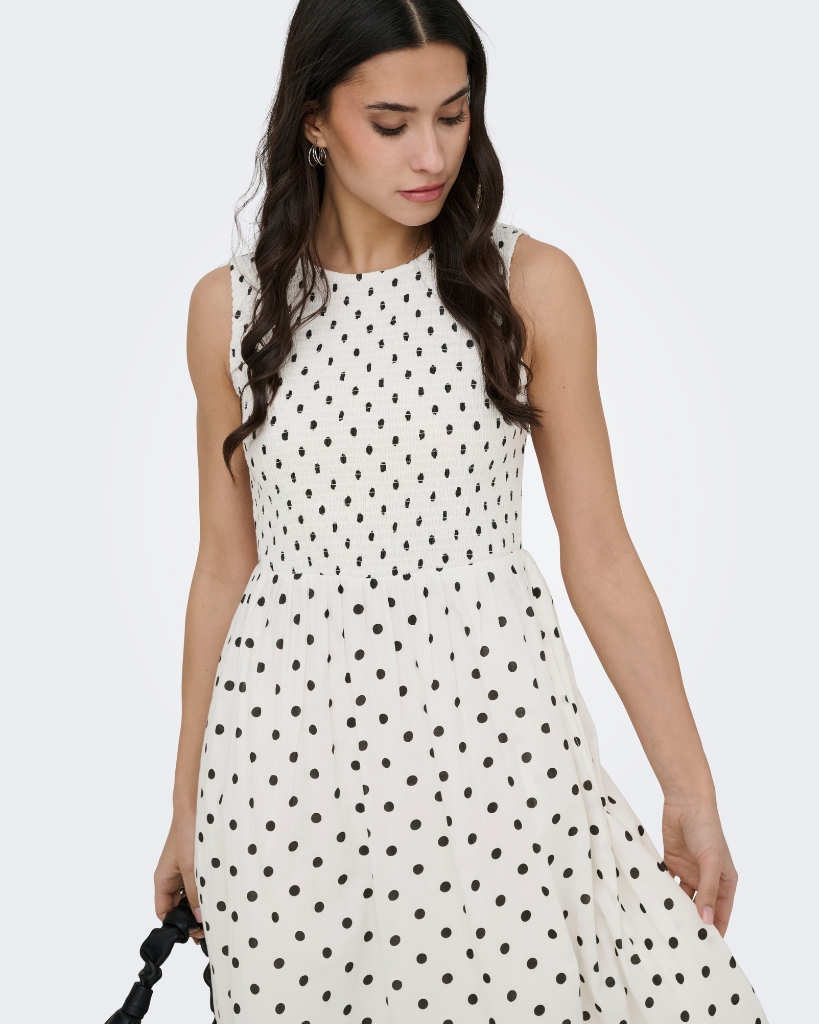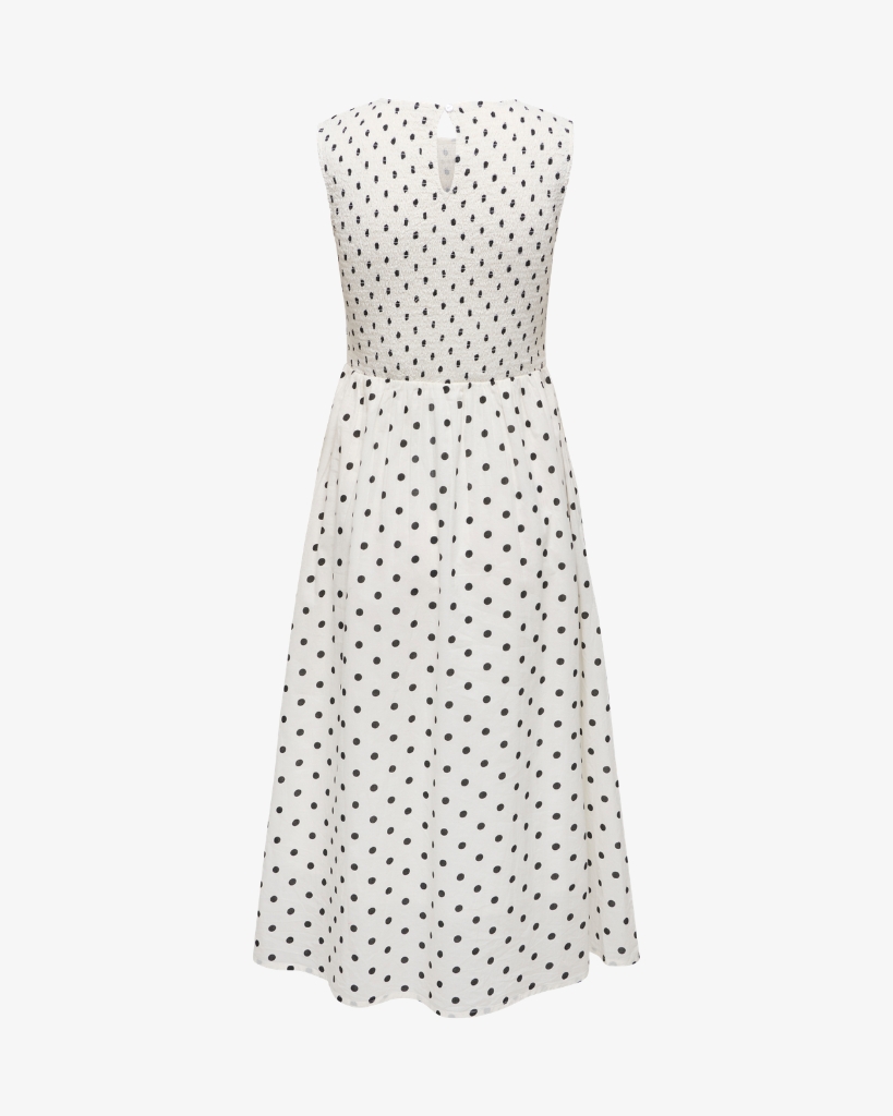 En feminin kjole med smockdetalje foroven og et let, luftigt skørt med prikker. Den ærmeløse model har et elegant udtryk med rund hals og en pasform, der falder flot. En stilren model med fine detaljer og behagelig komfort.
