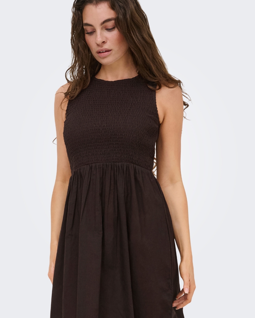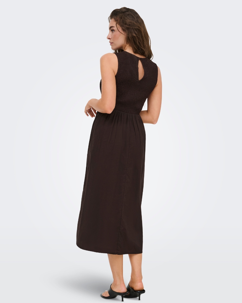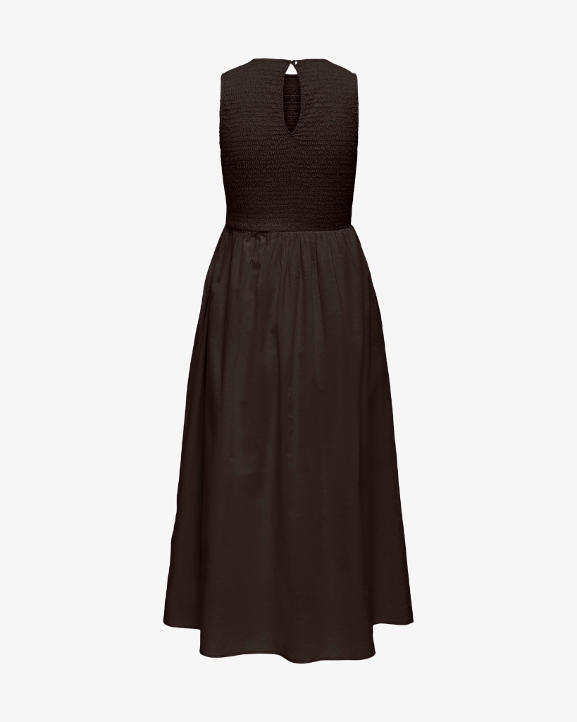 En feminin kjole med smockdetalje foroven og en let, vidde i skørtet. Den ærmeløse model har et enkelt udtryk med rund hals og en flot pasform, der falder blødt. En elegant model med fine detaljer og behagelig komfort.