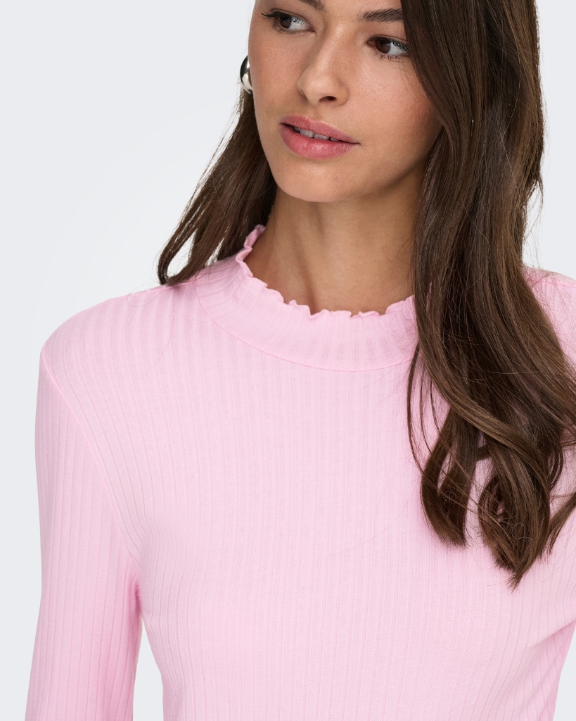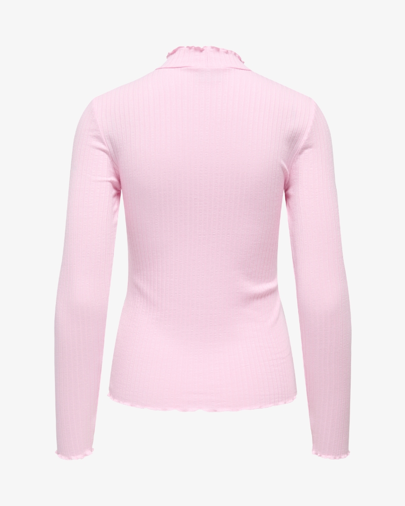 Opgrader basisgarderoben med denne feminine ribtop med smalle striber og en flot tætsiddende pasform. Den høje hals med fine flæsedetaljer giver et elegant udtryk, mens det bløde og strækbare ribstof sikrer en behagelig komfort hele dagen. En enkel top med et let dekorativt look.