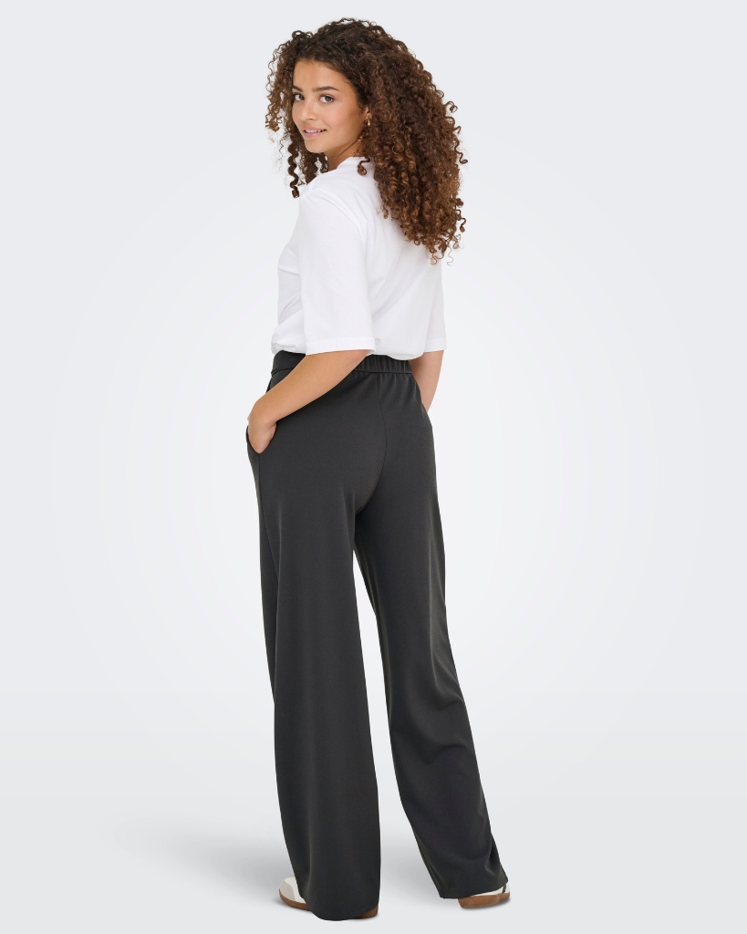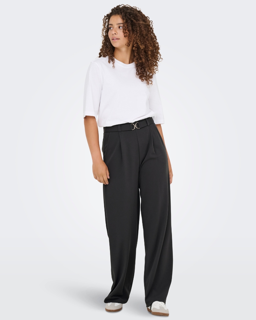 En elegant buks i blød jersey med vid pasform og smuk bælte-detalje foran. Komfortabel elastik bagpå gør den nem at have på hele dagen – perfekt til både skjorte og strik.