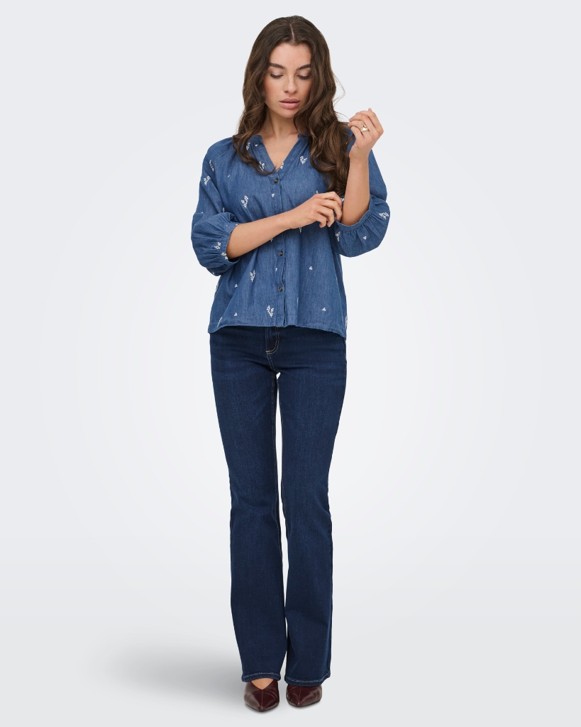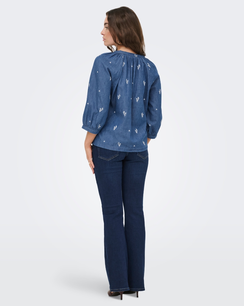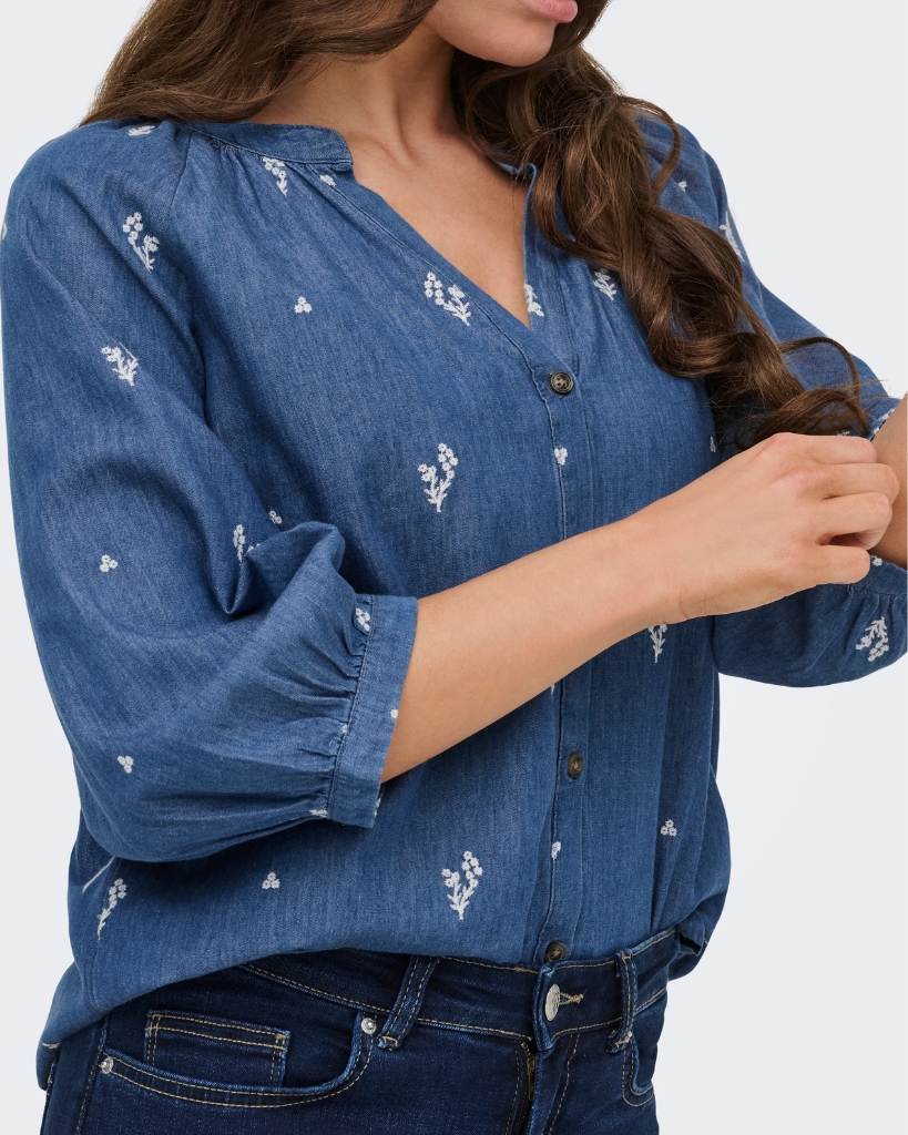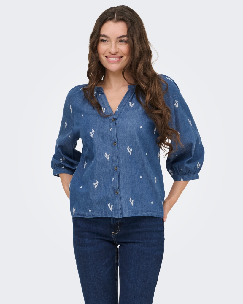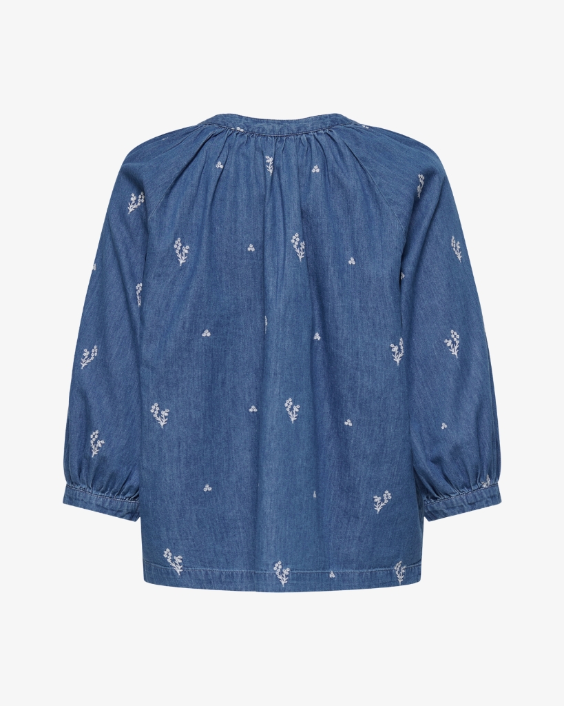 Let og feminin skjorte i blød denimkvalitet med fine, broderede detaljer. Den har en afslappet pasform med rund hals og knaplukning, der giver et enkelt og roligt udtryk. De lette ærmer med smock afslutning giver et behageligt fit. En nem style til hverdagen med et fint twist.