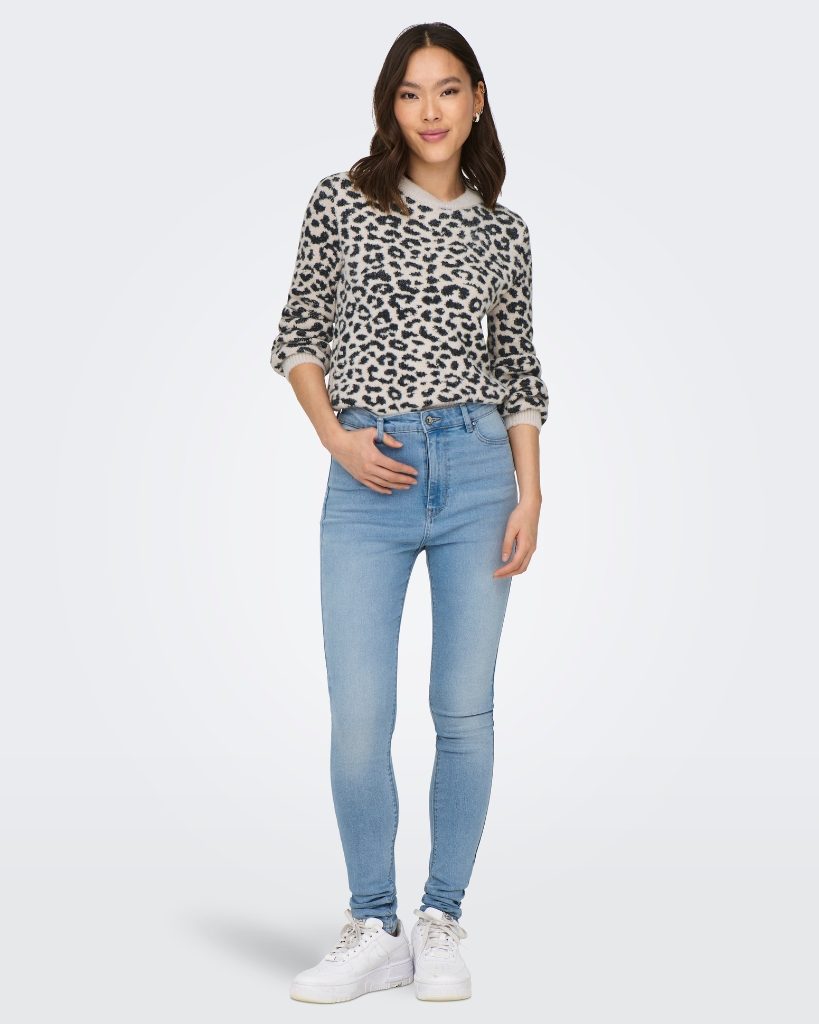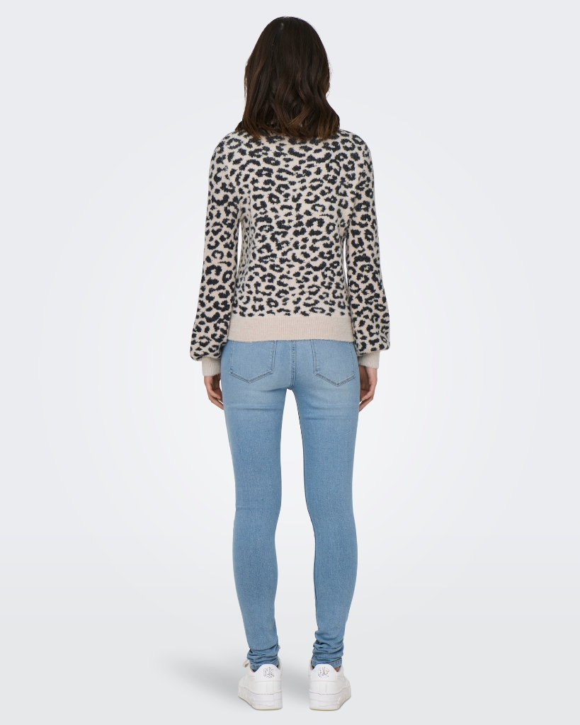 Dyreprintet strik med en blød overflade og lækker struktur. Klassisk rund hals og ribkanter giver et afslappet, men stilsikkert udtryk.
