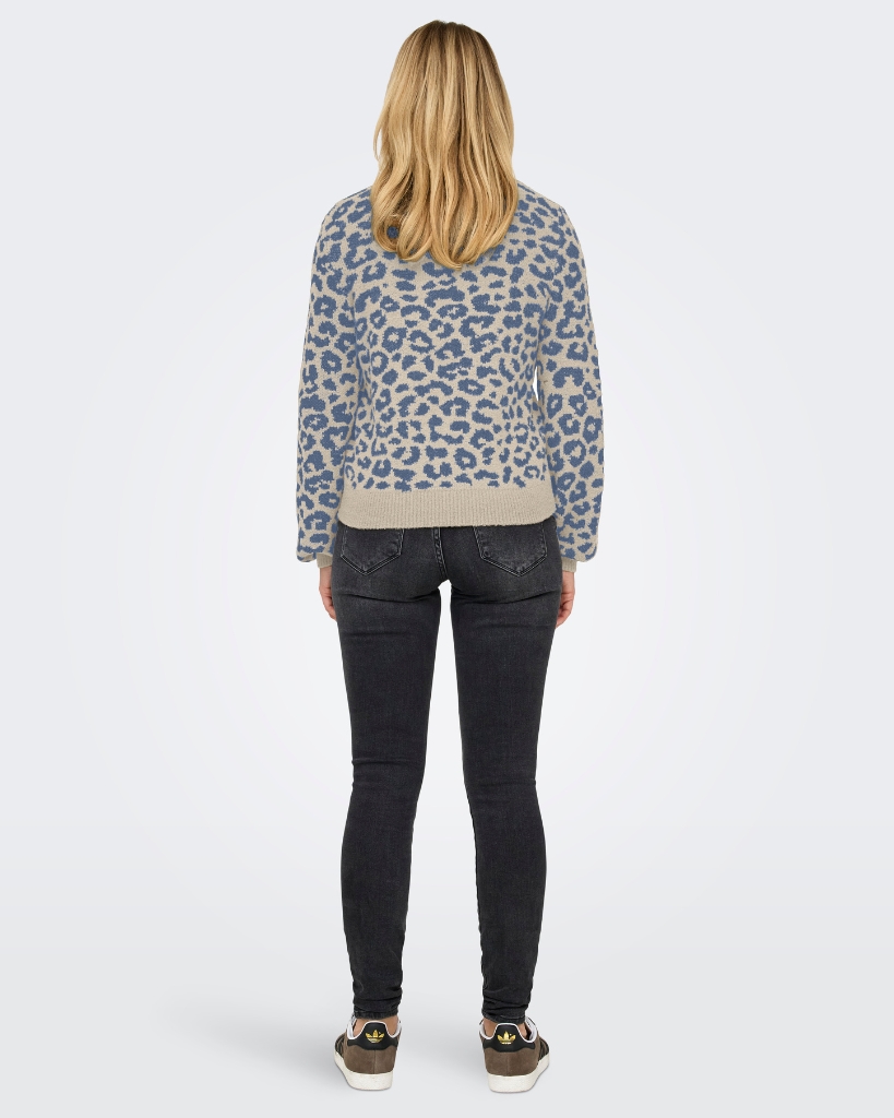 Dyreprintet strik med en blød overflade og lækker struktur. Klassisk rund hals og ribkanter giver et afslappet, men stilsikkert udtryk.