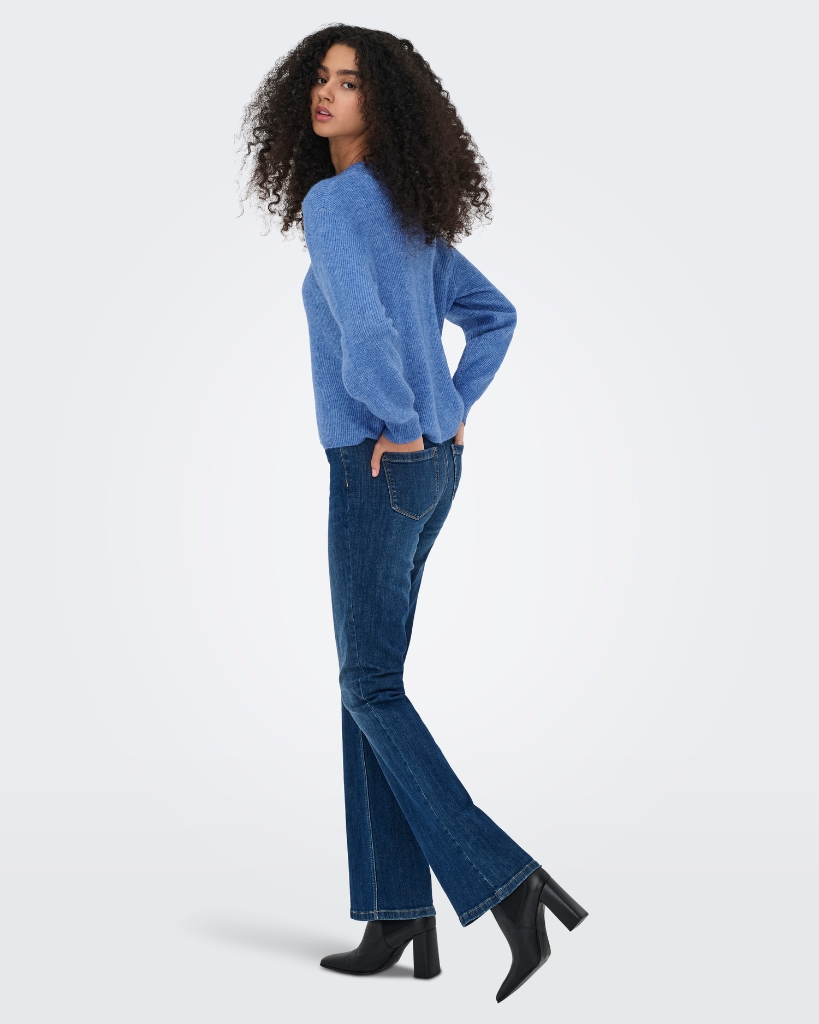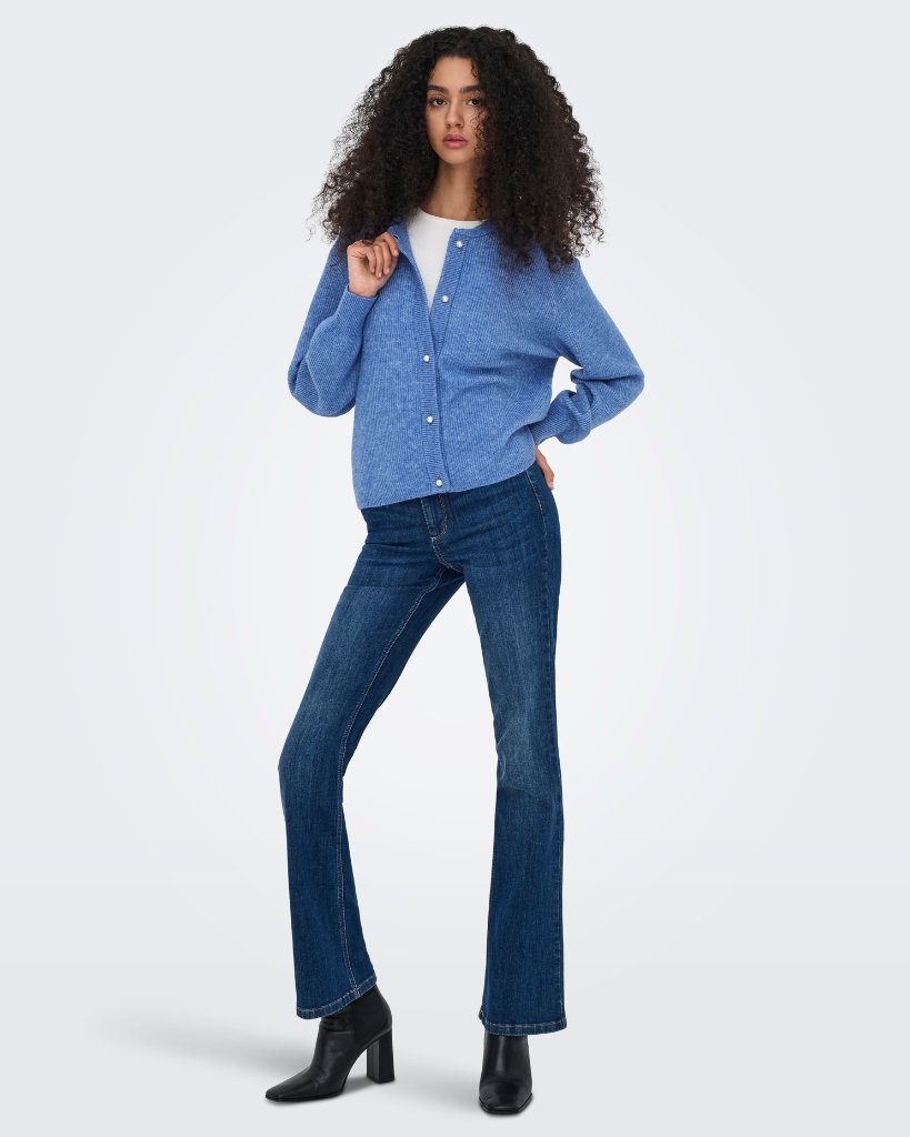 Tilføj et strejf af farve med denne smukke cardigan i blå. Den har elegante perleknapper og er strikket i en blød, let elastisk kvalitet, der sikrer god komfort og pasform. Et feminint og tidløst valg til din hverdagsgarderobe.