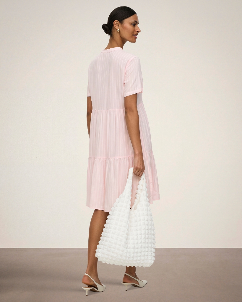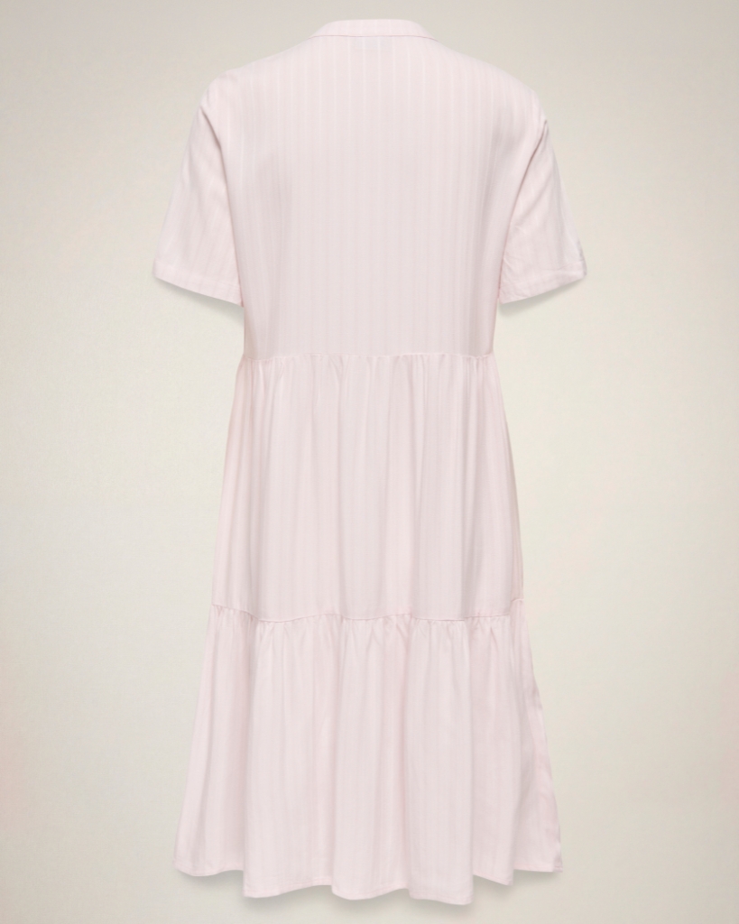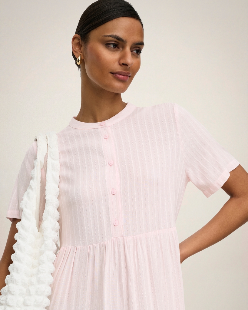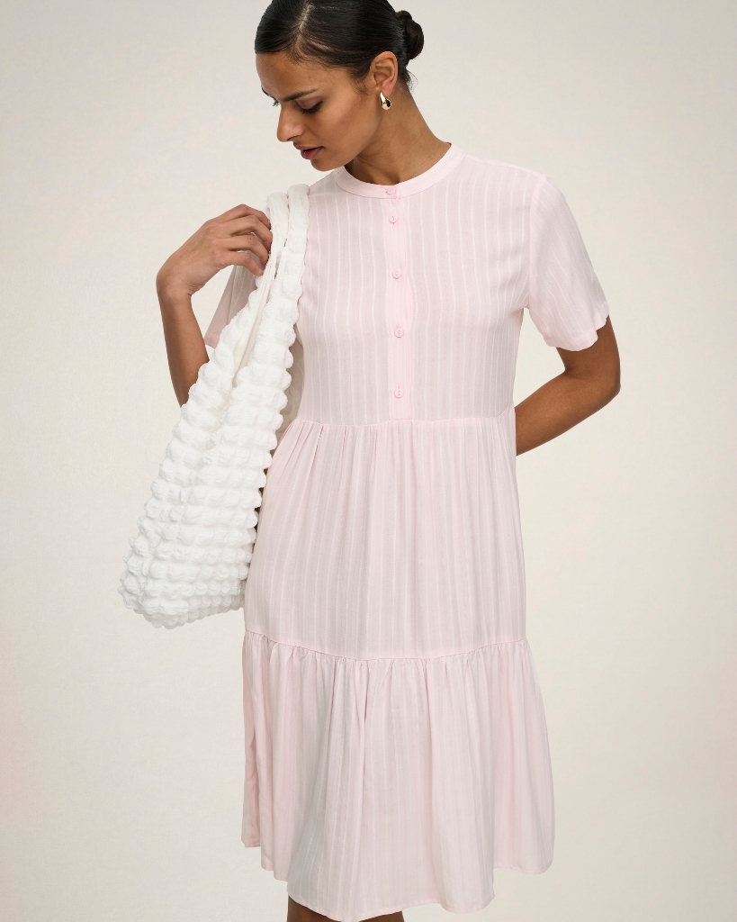 Let og feminin kjole fra JDY i en blød viskosekvalitet med diskret struktur. Den har kinakrave, korte ærmer og knaplukning foran, som giver et enkelt og stilrent udtryk. Den løse pasform og fine skæring giver et flot og afslappet fald.