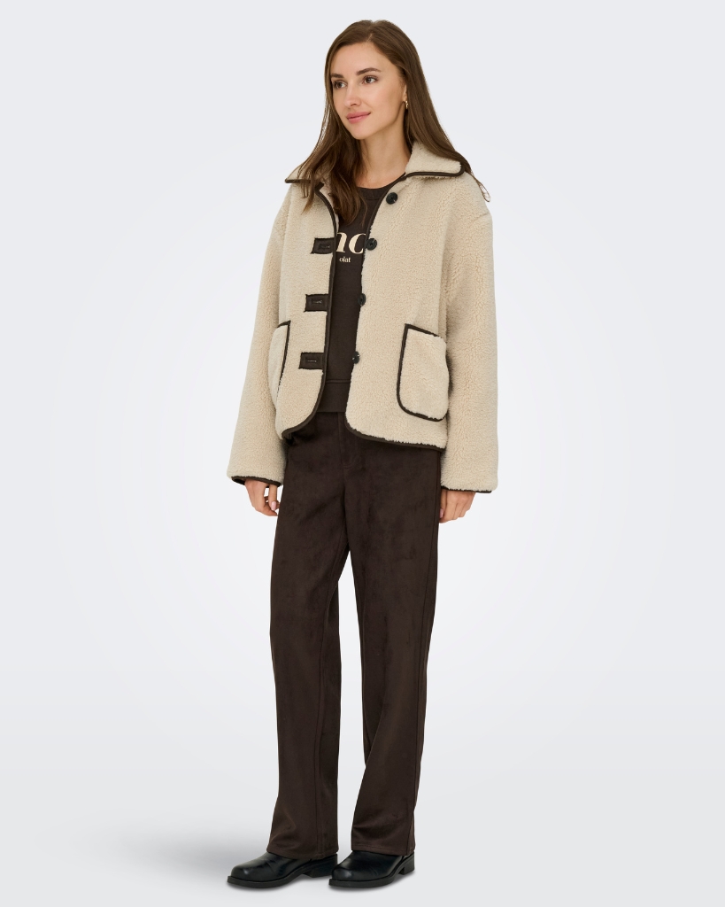 Varm og stilfuld teddyjakke med kontrastdetaljer i imiteret læder. Den bløde overflade og rummelige lommer gør den perfekt til kolde dage. Et hyggeligt og moderigtigt valg til efteråret og vinteren.