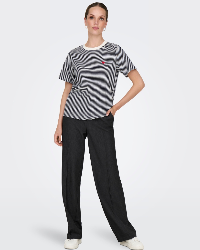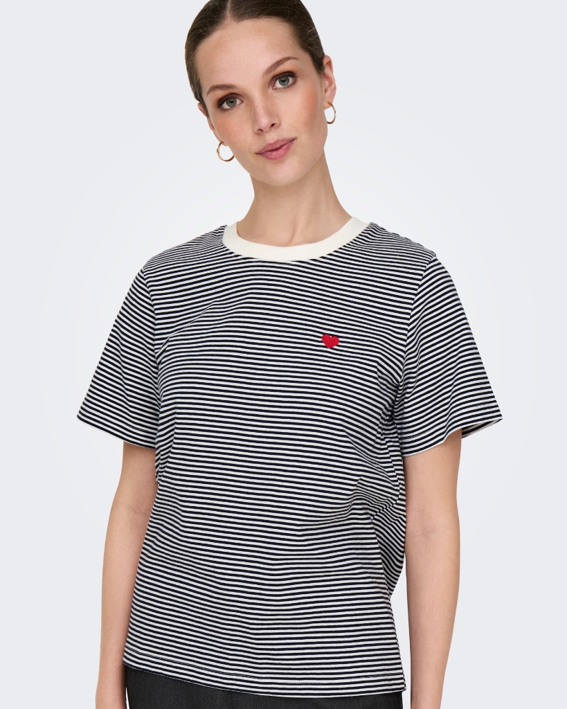 Giv din garderobe et frisk pust med denne stribede t-shirt. Det lille røde hjertebroderi tilfører et feminint og stilrent touch. En klassiker, der både er behagelig og stilfuld til hverdagsbrug