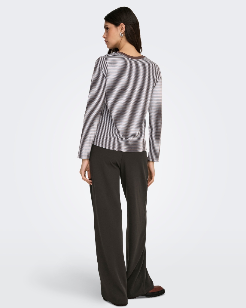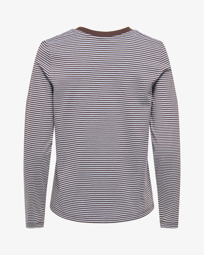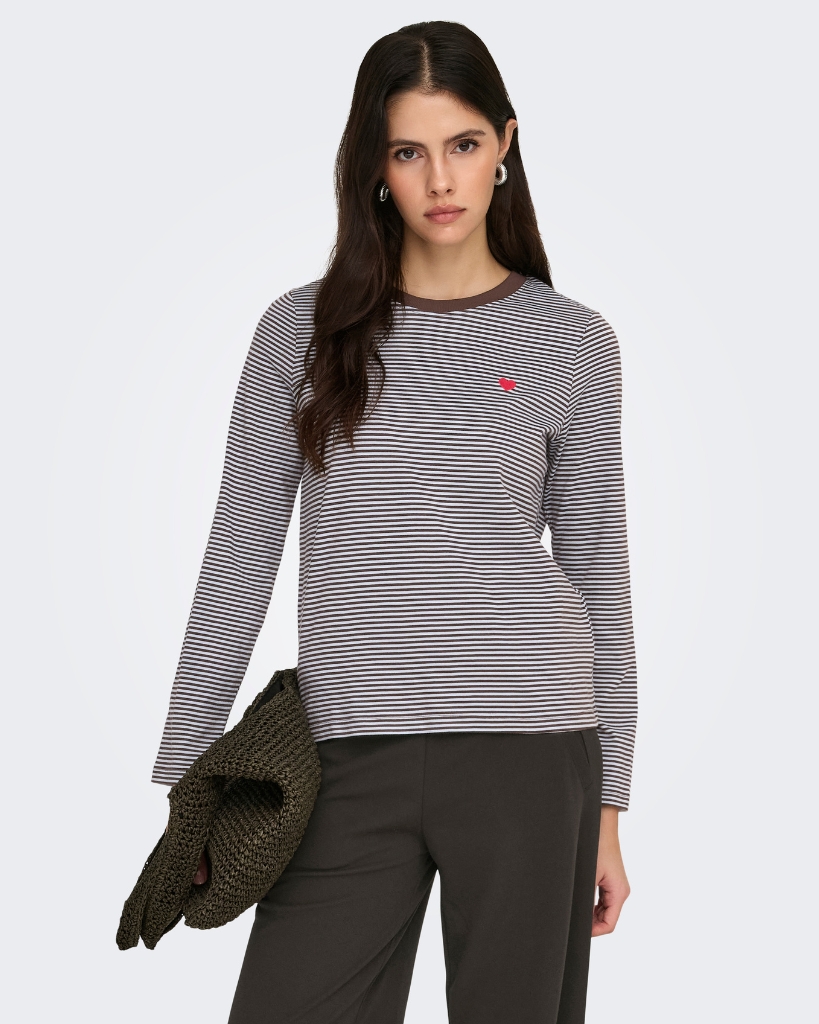 Stribet langærmet top fra JDY i en skøn brun og lyseblå farvekombination. Den er lavet i blød bomuld, har rund hals og en lille broderet hjerte-detalje på brystet. En enkel, men charmerende style til hverdagens basisgarderobe.