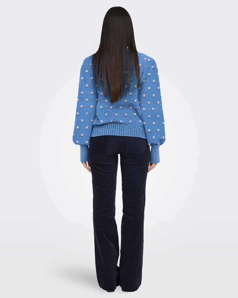 En iøjnefaldende blå strik med fine, hvide prikker i 3D-struktur. Det feminine snit og de høje ribkanter skaber en flot silhuet.