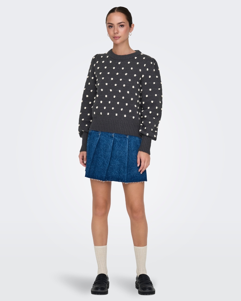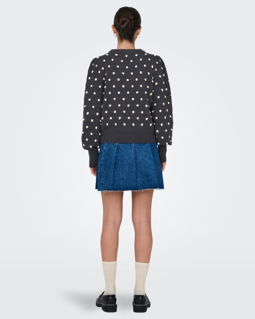 Blød strik i mørkegrå med hvide 3D-prikker. Den rundhalsede model har et feminint og hyggeligt udtryk, og de ribbede kanter giver en flot finish.