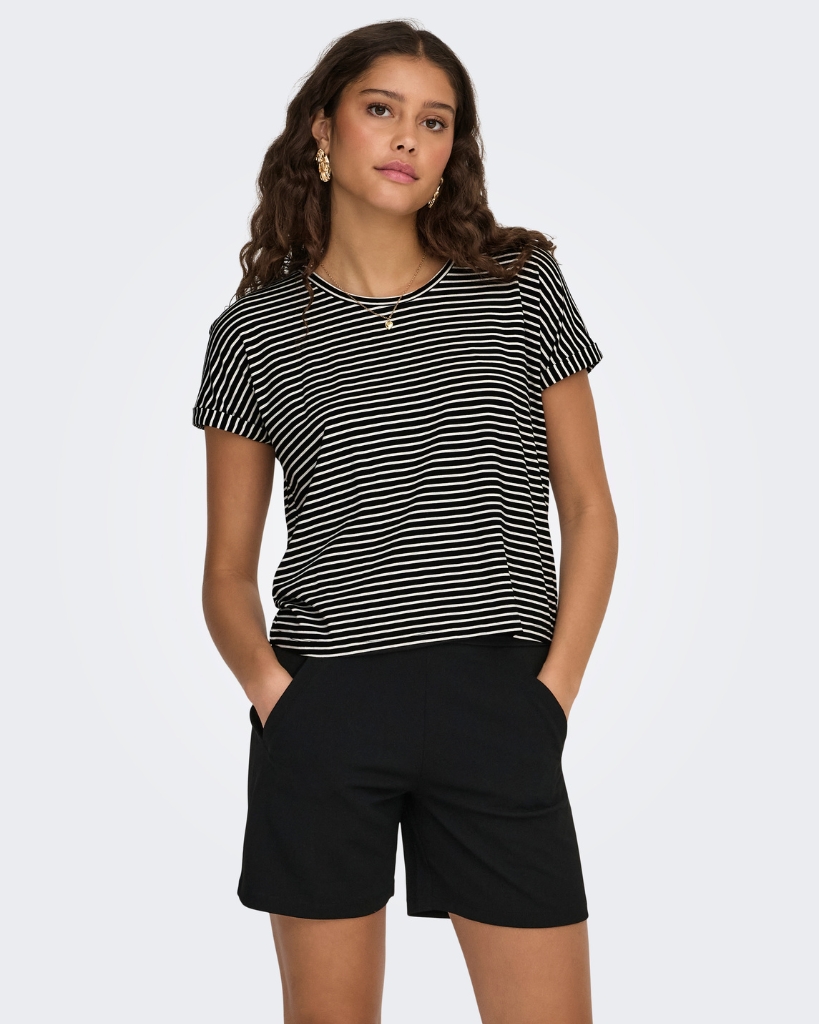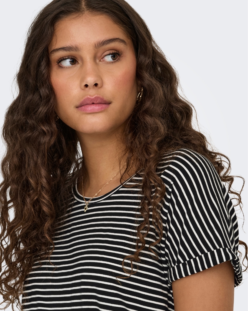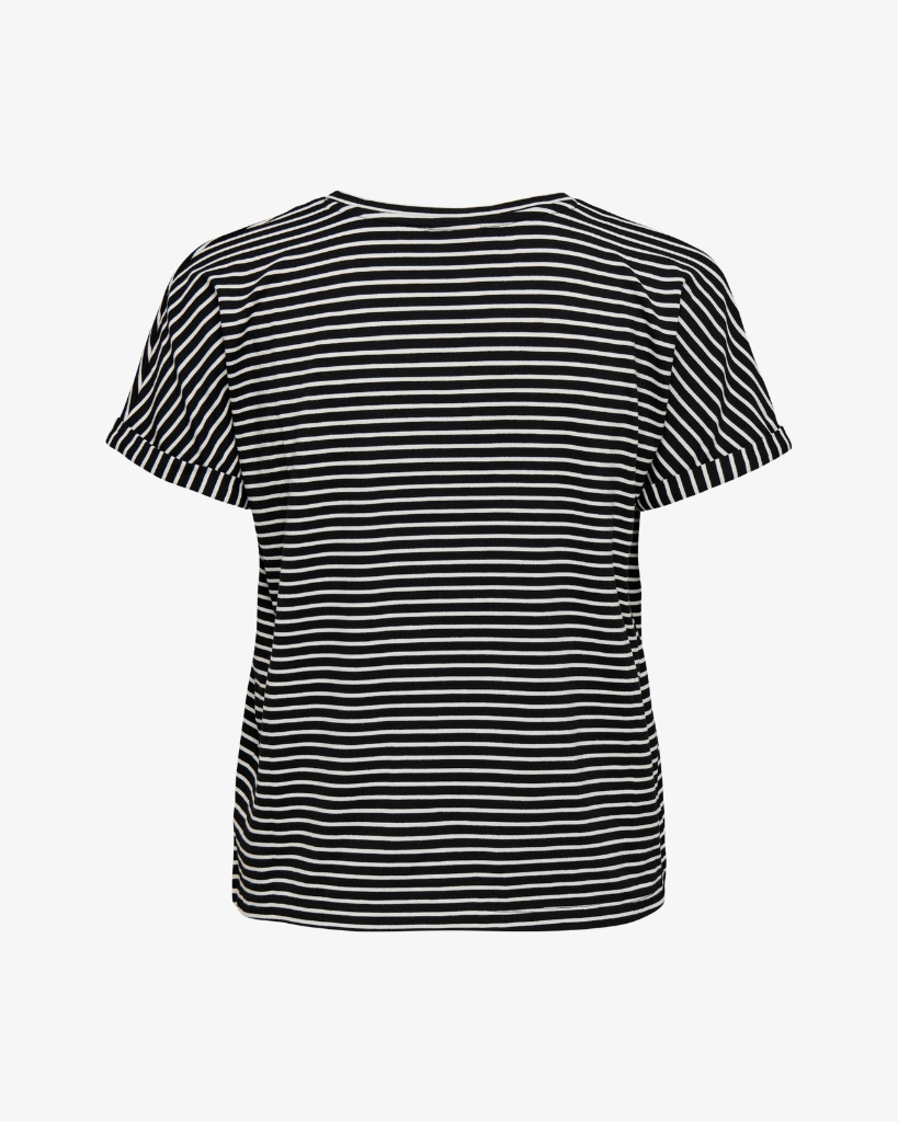 En klassisk stribet t-shirt i blød viskose, der føles let og behagelig mod huden. De mørkeblå og hvide striber giver et rent og tidløst udtryk, mens den afslappede pasform og de let sænkede skuldre sikrer god komfort. En enkel basisstyle med flotte detaljer.