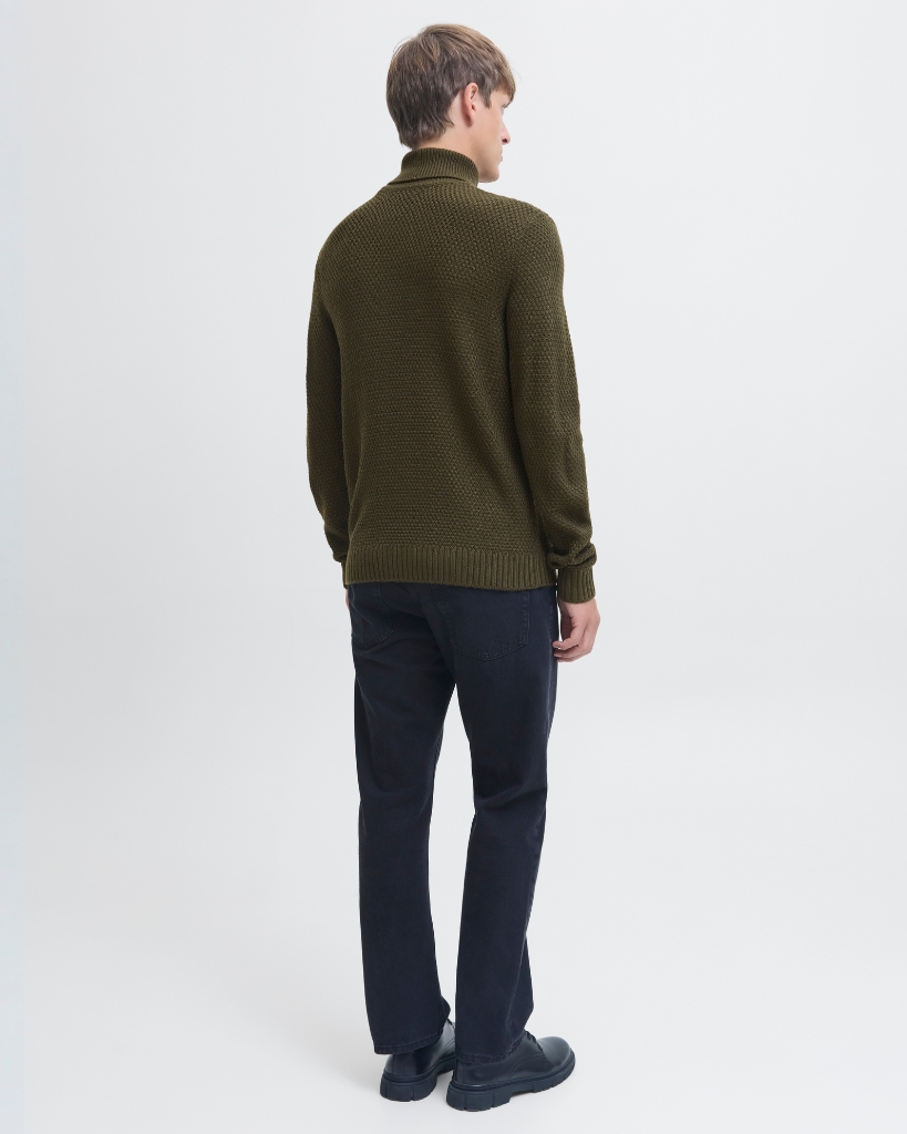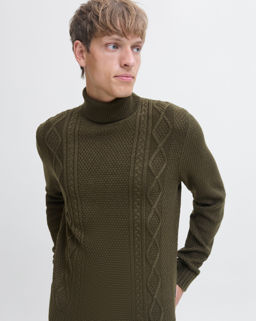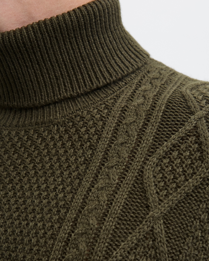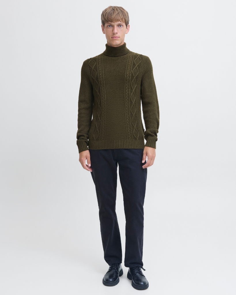Josh rullekravestrikken i farven Forest Night kombinerer varme og stil i et klassisk design. Den bløde strik med kabelmønster giver struktur, mens rullekraven beskytter mod kulde. Et ideelt valg til efterårs- og vintergarderoben.