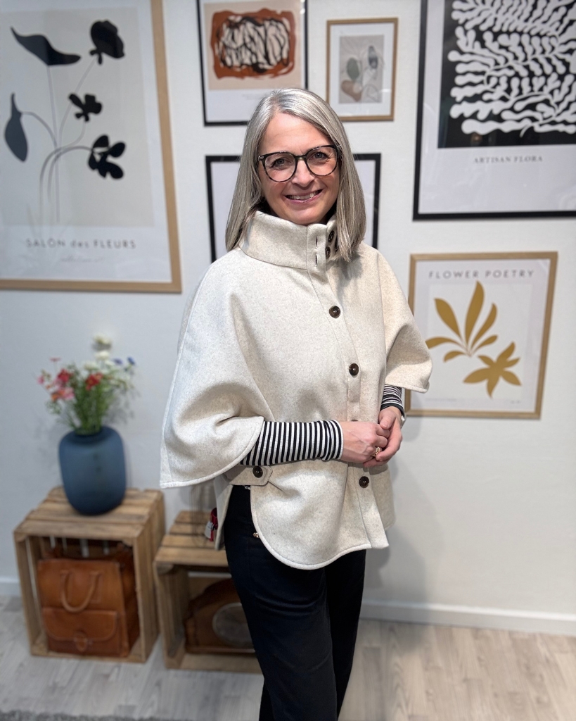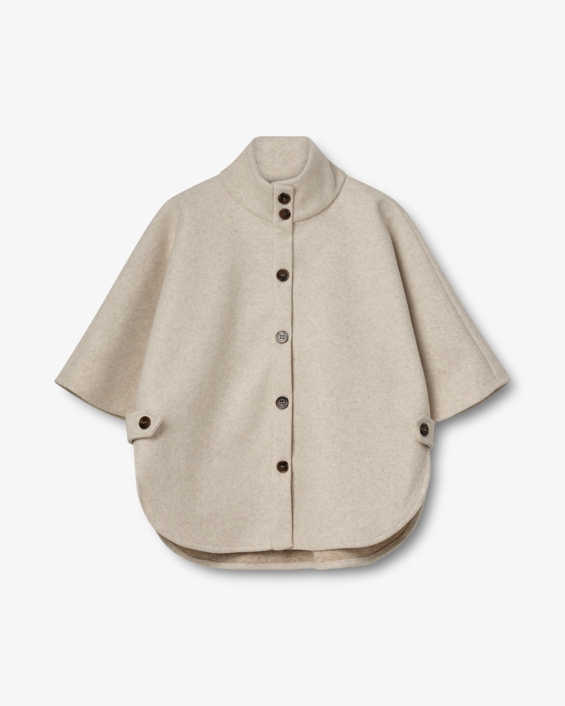 Gør dit outfit komplet med denne elegante poncho i en blød uldlook-kvalitet. Designet har knapper foran og i siderne samt et diskret logo i nakken. Perfekt som et let lag over strik eller skjorte.