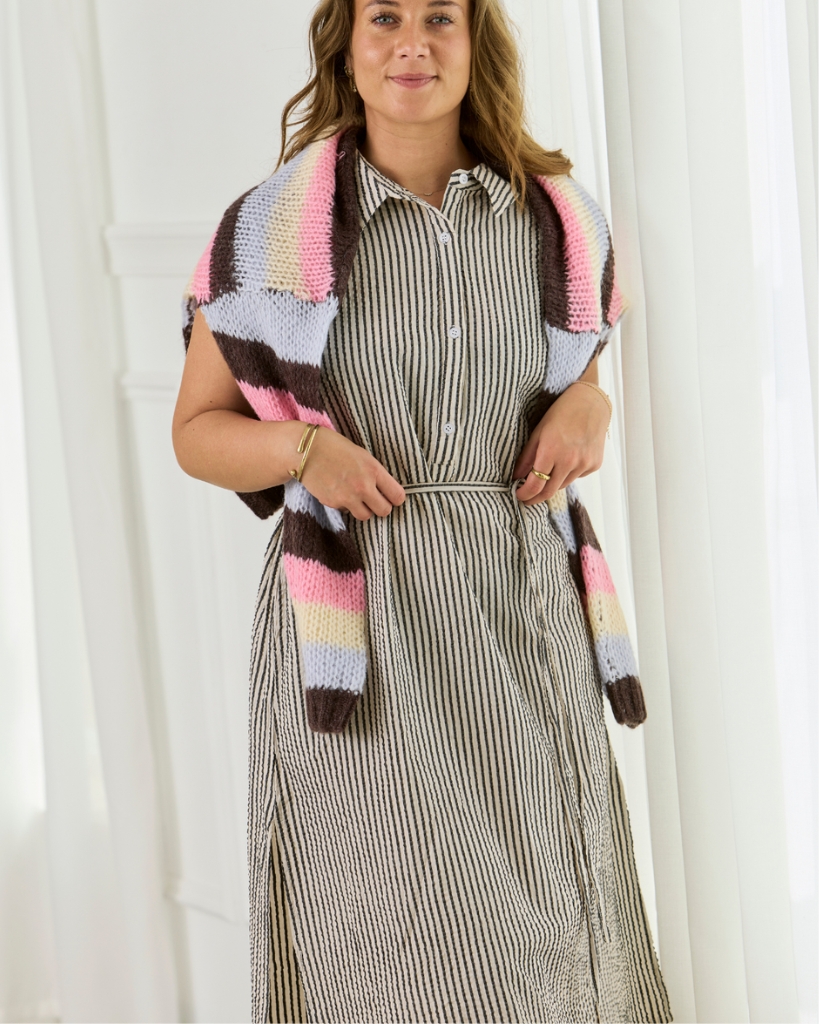 Klassisk skjortekjole fra Kopenhaken i 100% bomuld med smalle striber. Den har skjortekrave, ærmeløst design og knaplukning foran, som giver et rent og tidløst udtryk. Det aftagelige bindebånd i taljen giver mulighed for at tilpasse pasformen. Slids i siden.