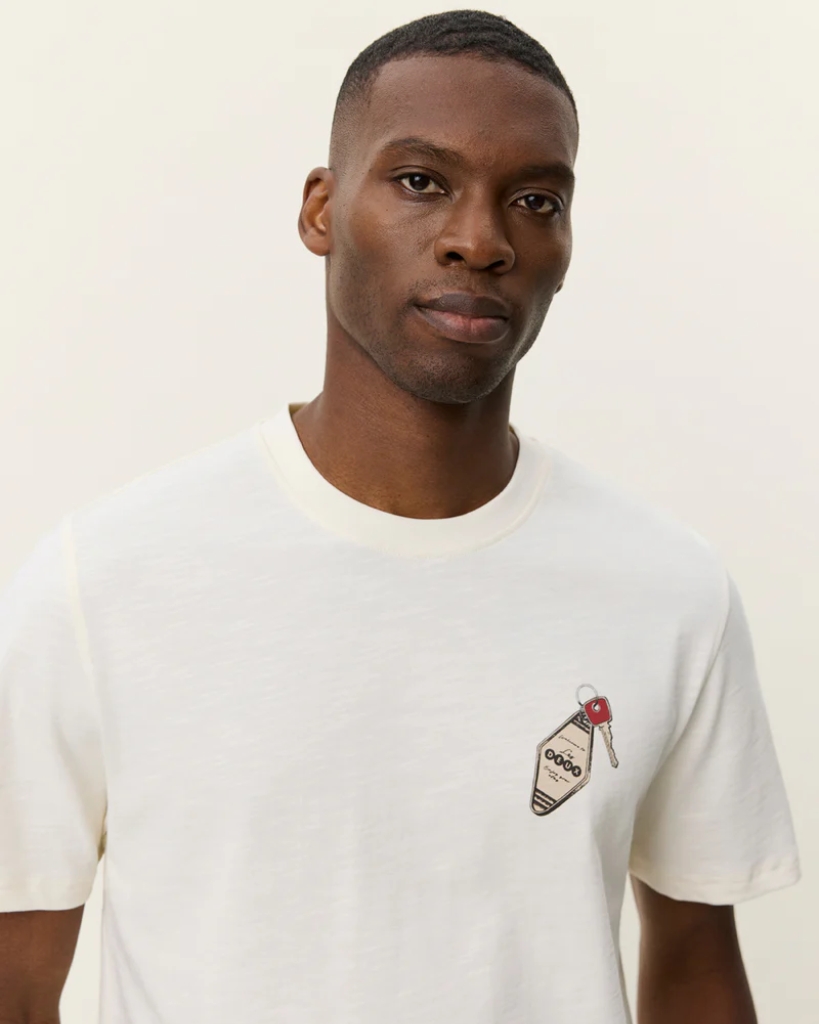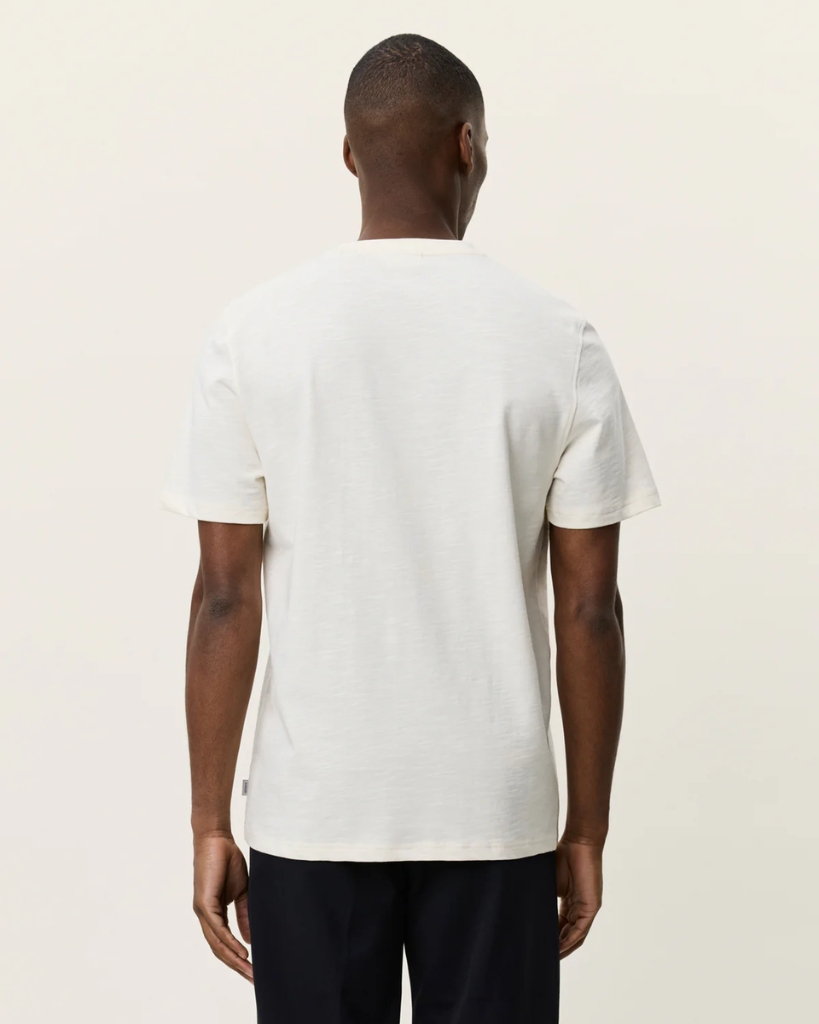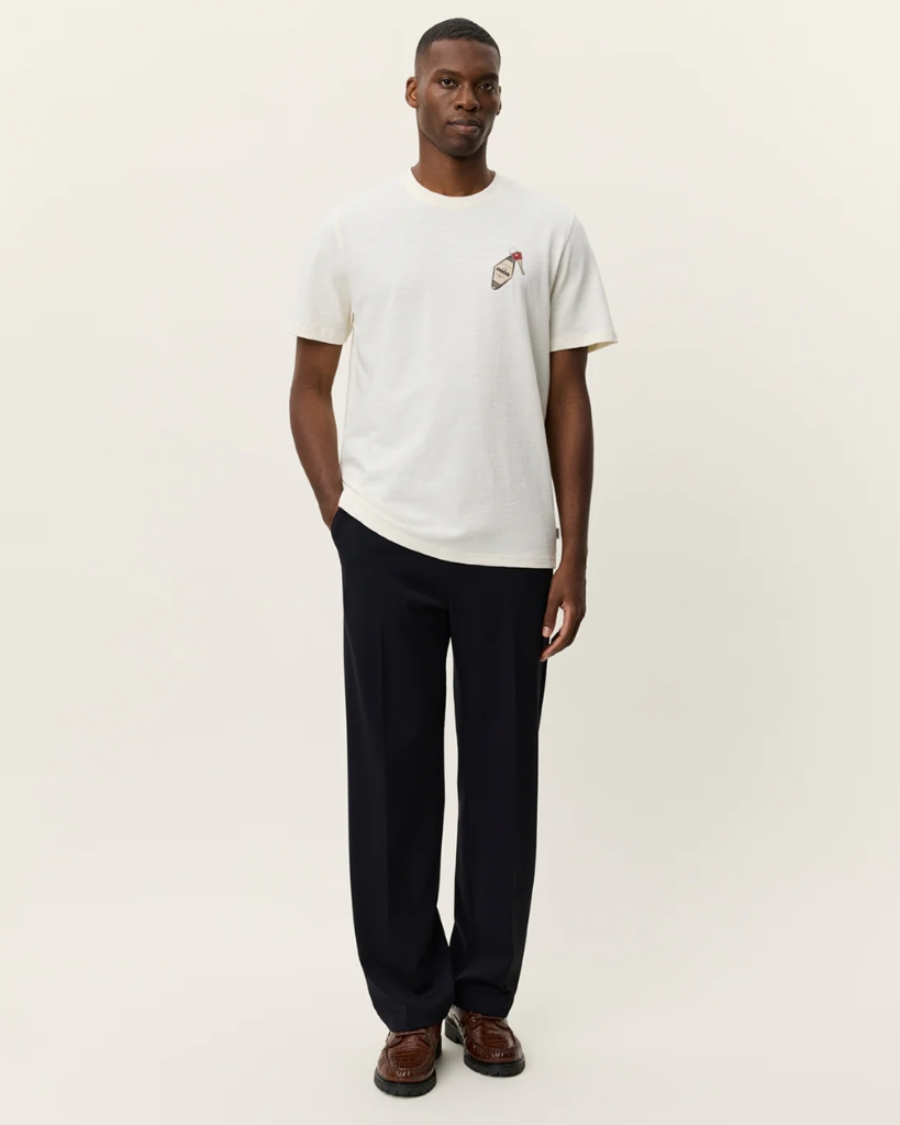 En afslappet t-shirt i blød, tekstureret slubjersey, der giver et levende og naturligt udtryk. Den har en klassisk pasform og rund hals, som sikrer en behagelig fornemmelse hele dagen. Det flerfarvede brystmotiv tilfører et diskret, sæsonpræget twist til det enkle design.