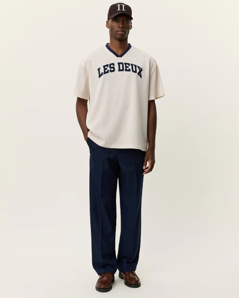 Sporty og afslappet mesh-t-shirt med tydelig reference til basketball og college-stil. Den har kasseformet pasform, V-hals med kontrast og store brystpatches, som fuldender det grafiske udtryk.