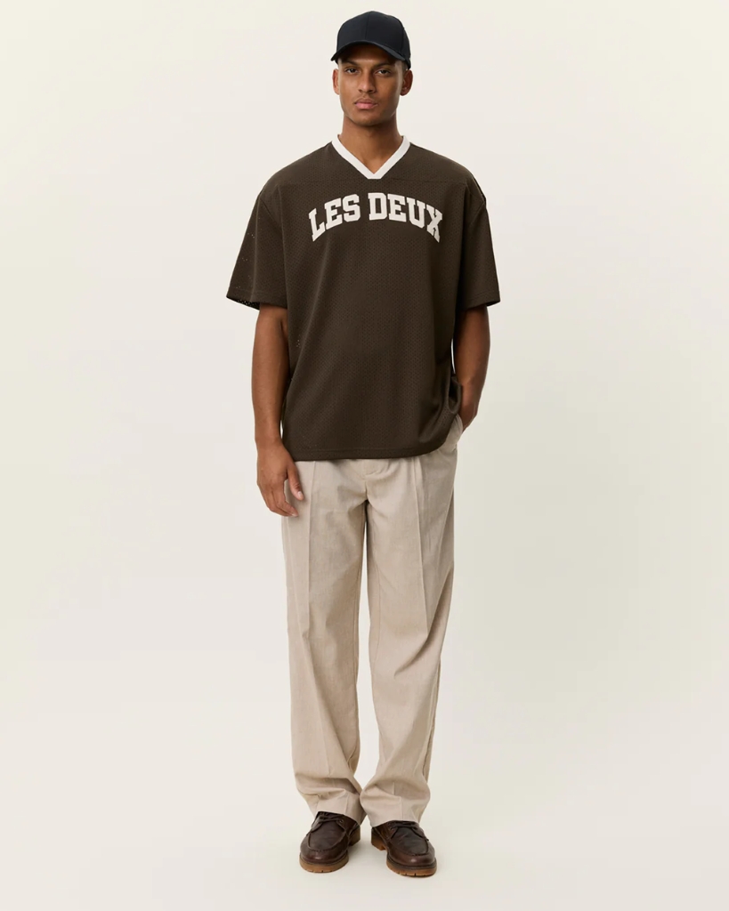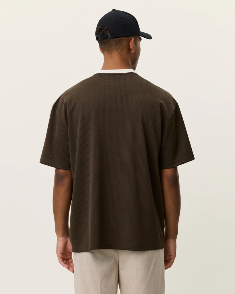 En sporty mesh t-shirt i basketballstil med markant brystprint og kontrastfarvet V-hals. Den er lavet i let, genanvendt polyester og har en afslappet, boxy pasform.