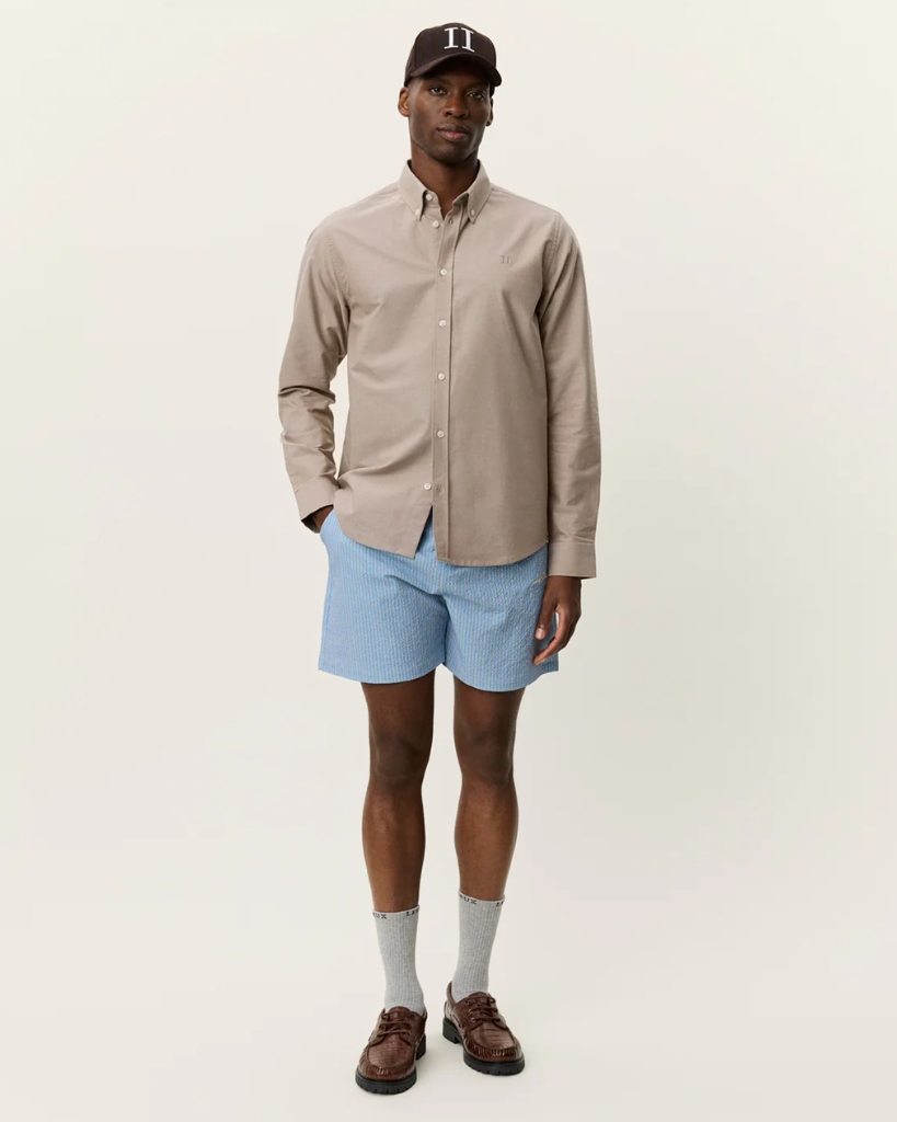 En klassisk Oxford skjorte i en blød bomuldsblanding med let stretch, der giver en behagelig og fleksibel pasform. Den har button down krave og et diskret, tonalt broderi på brystet for et rent og gennemført udtryk. Den buede søm afrunder designet og sikrer en pæn afslutning.