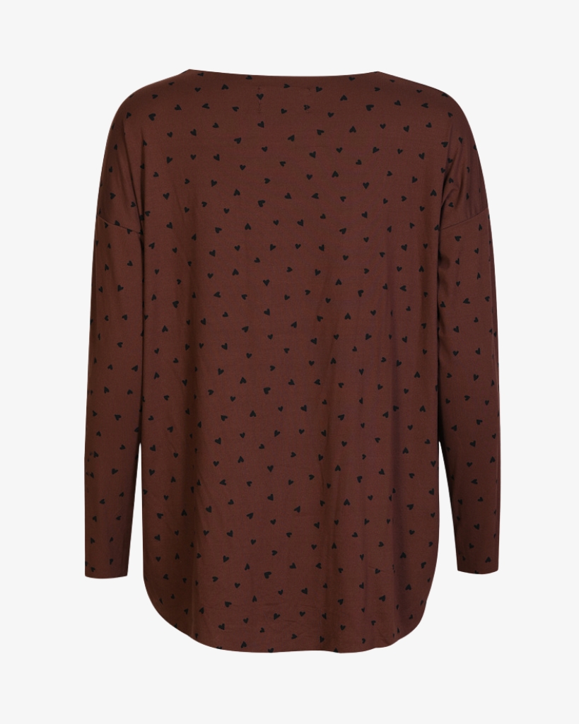 Denne langærmede top fra Alma-serien kombinerer enkelt design med et feminint twist. Det brune stof prydes af små sorte hjerter, og den løse pasform gør den ideel til både komfort og stil i hverdagen.