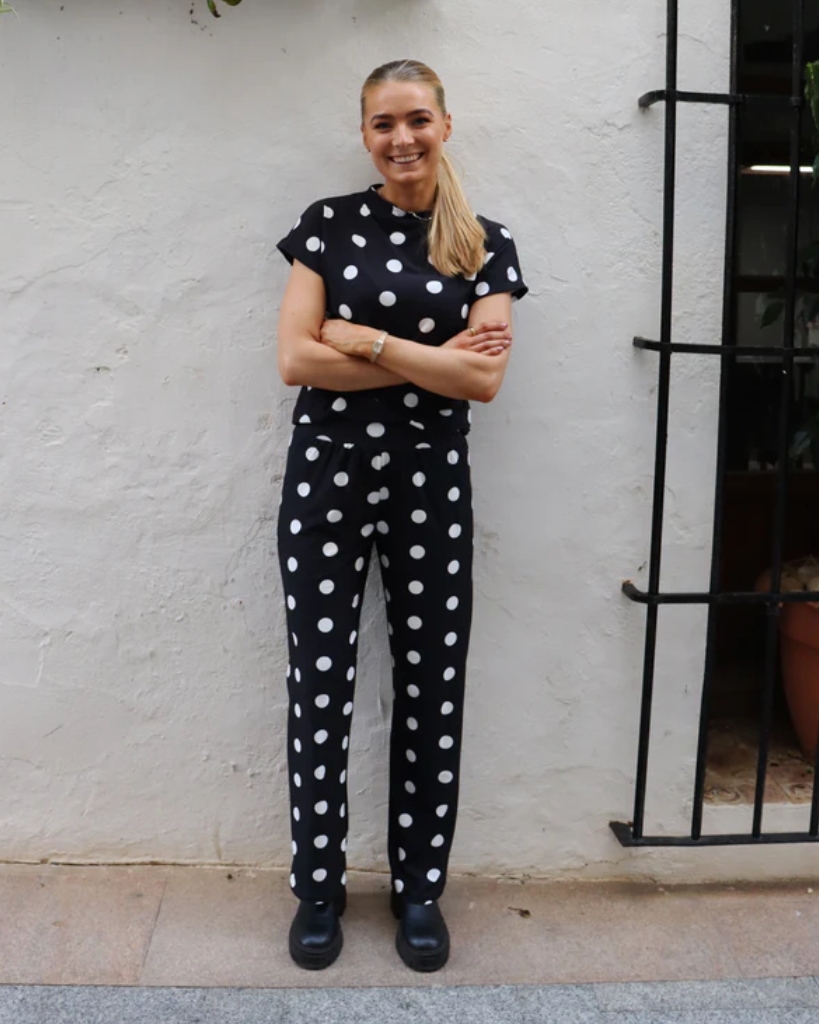 Smarte bukser i sort med store, iøjnefaldende prikker og en elegant, bred benvidde. Den elastiske talje giver en behagelig pasform, og den lette kvalitet falder flot langs benene. Et stilrent valg med masser af komfort.