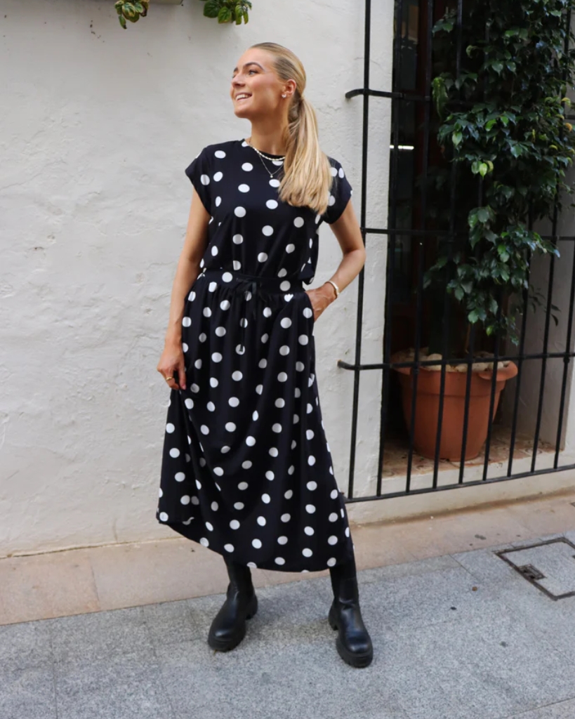 En klassisk t-shirt i sort med store, markante prikker og et rent, enkelt snit. Den har korte ærmer og rund hals, og den bløde stretchkvalitet giver en flot pasform. En let og behagelig model med et grafisk udtryk.