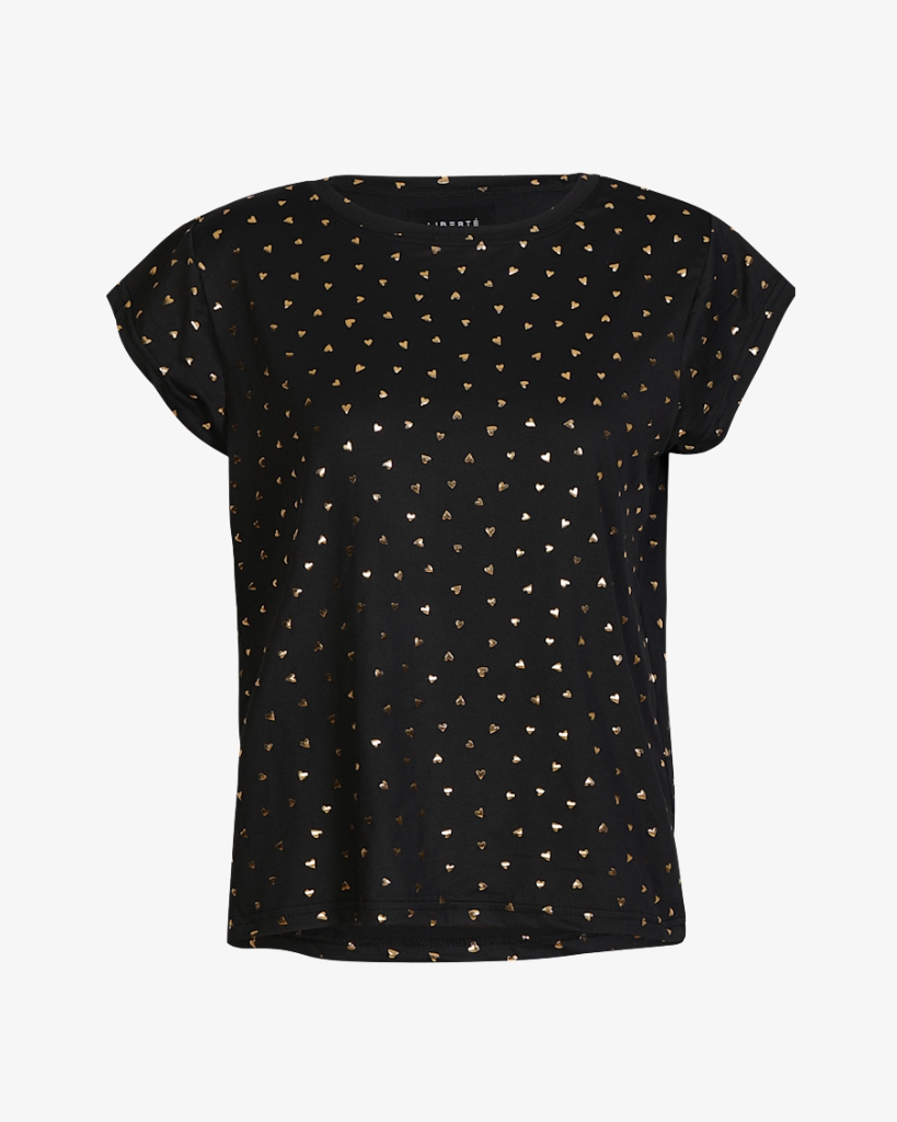 Et skinnende medlem af Alma-serien – denne sorte t-shirt fra Liberté er pyntet med små gyldne hjerter, der tilfører et feminint twist. T-shirten har en løs og behagelig pasform med let stræk og korte ærmer.