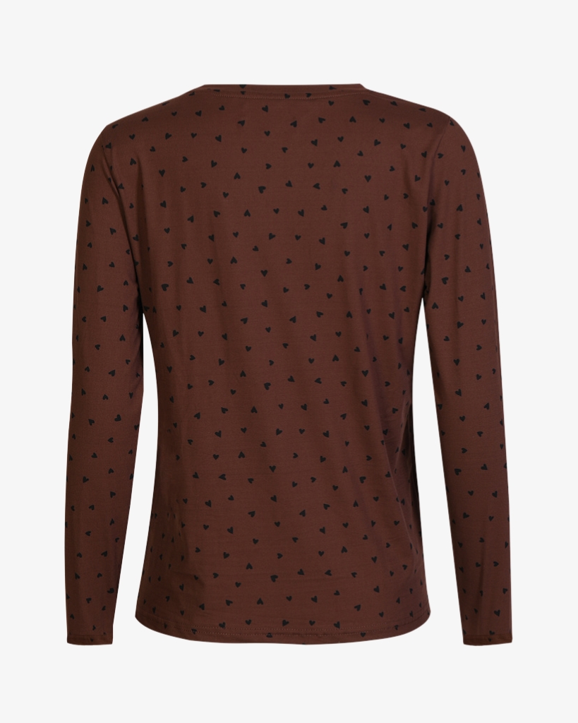 Denne langærmede top fra Alma-serien skiller sig ud med sin elegante twist-detalje i siden. Det bløde materiale og de små sorte hjerter giver et feminint og flatterende udtryk – perfekt til både hverdag og hygge.