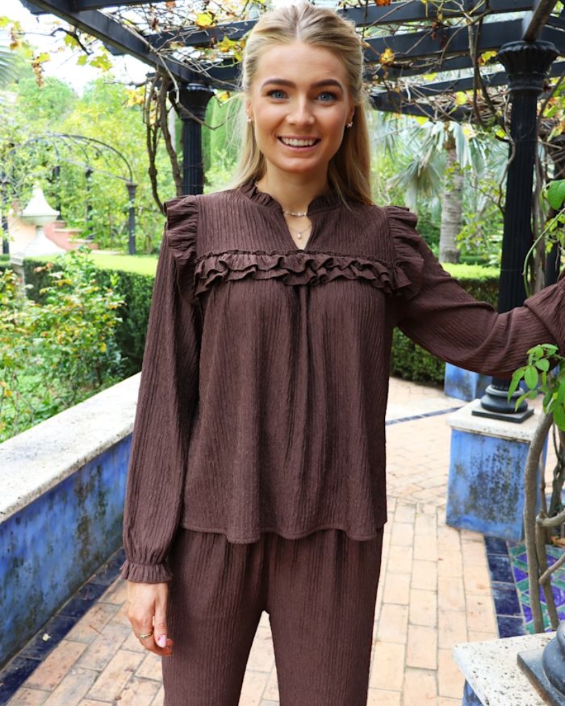 Feminint design fra Liberté med fine flæsedetaljer og en let struktureret kvalitet, der giver et elegant udtryk. Blusen har en løs pasform med diskrete rynker ved skuldrene og en lille ståkrave, som giver et flot fald. Perfekt sammen med de matchende Anni bukser for et gennemført look.