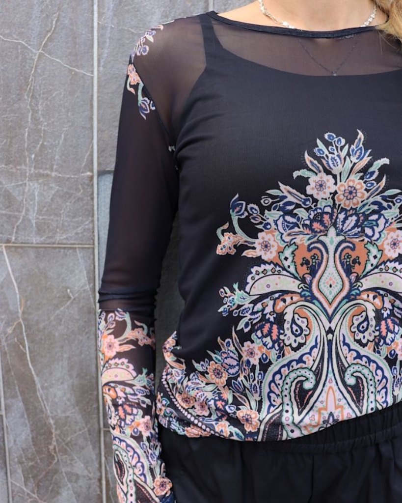 Gør plads til print med denne mesh-bluse fra Liberté. Den tætsiddende model har et smukt paisley-inspireret mønster i bløde farver, og det let gennemsigtige materiale giver et feminint og moderne udtryk. Perfekt under en vest, blazer eller alene med top under.