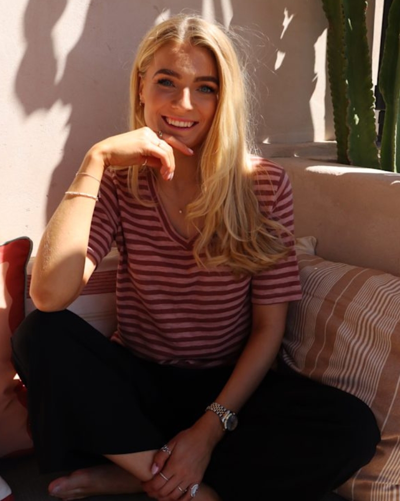 Skøn t-shirt med striber i rosa og mørk rosa, der giver et frisk og feminint udtryk. Den løse pasform og bløde metervare gør den utrolig behagelig at have på. V-halsen fremhæver halsudskæringen og giver et klassisk look med lidt ekstra kant.