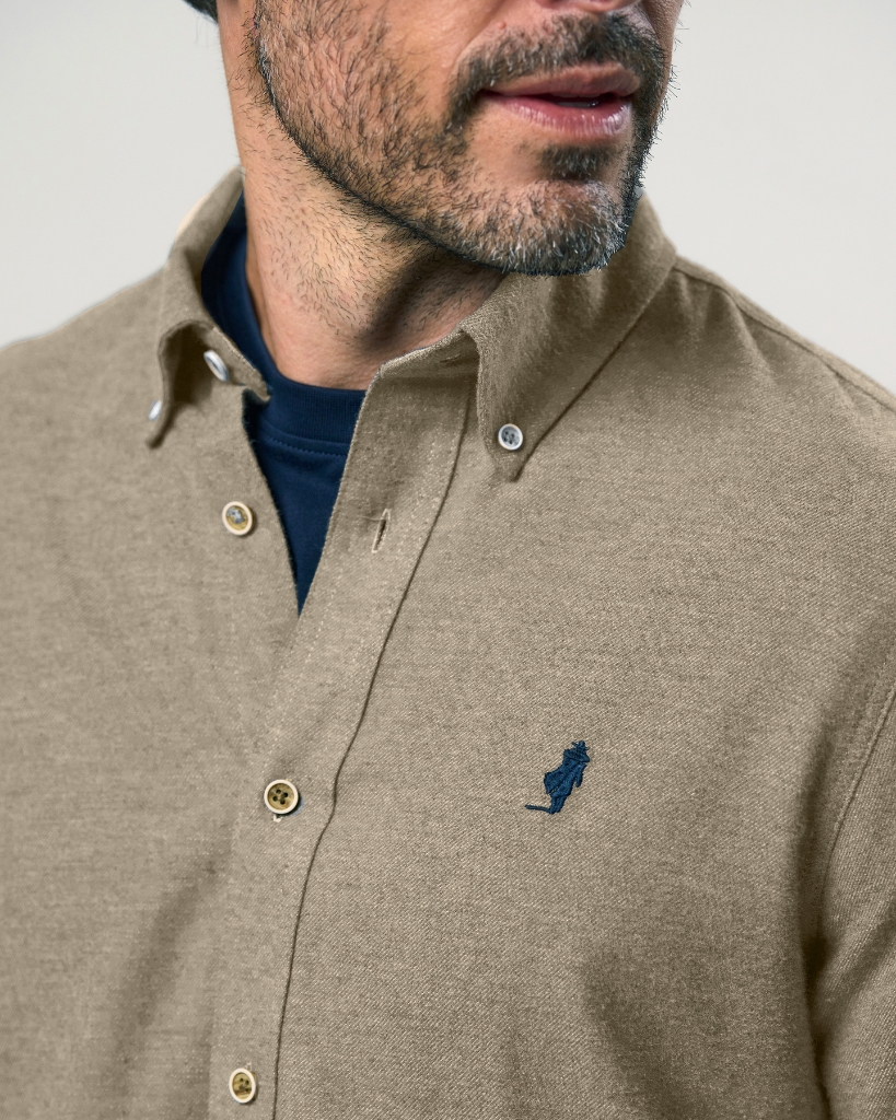 Adam er en klassisk skjorte i børstet bomuld, der giver en blød og varm fornemmelse. Den har regular fit, button-down krave og fine detaljer som kontrastkrave og broderet Rider-logo på brystet.