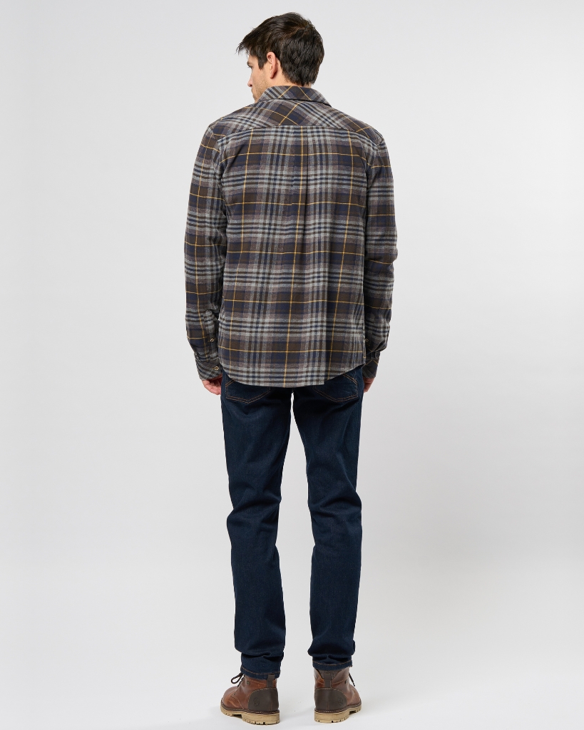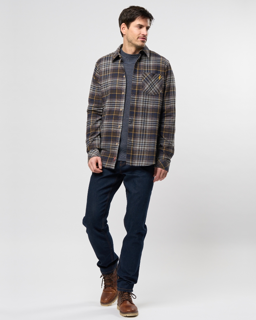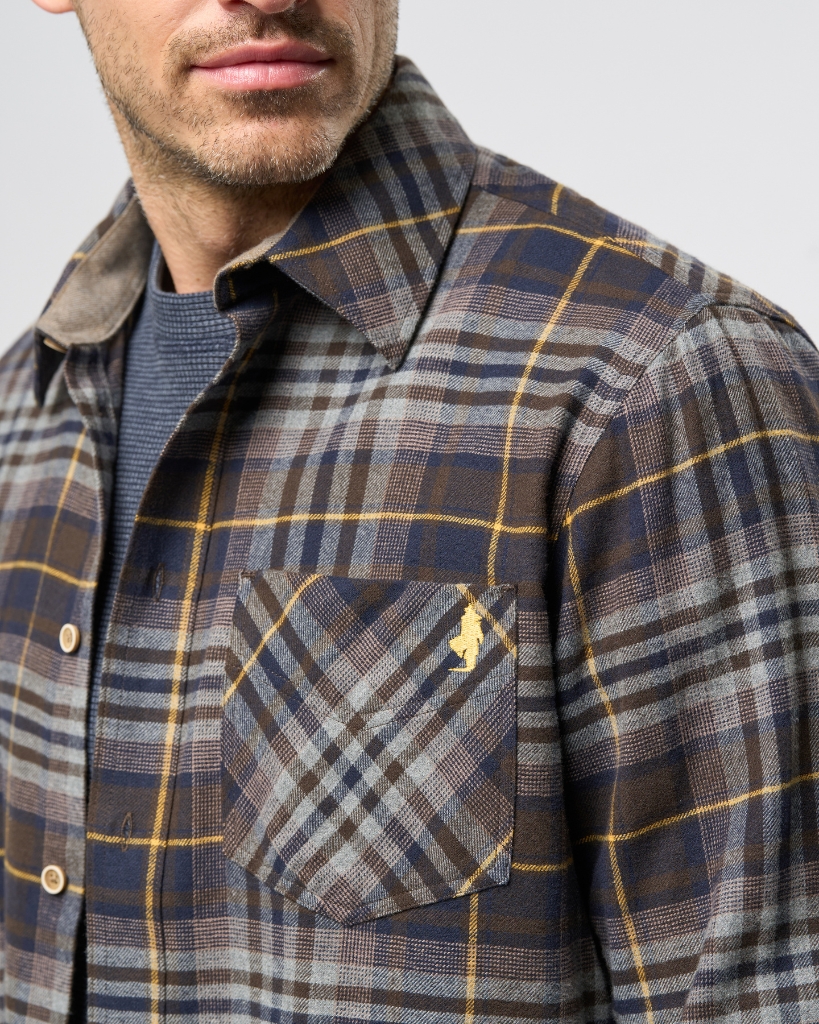 Henry er en blød skjorte i 100% bomuld med markante tern i mørke, varme nuancer. Den skråt skårne brystlomme med kontrastbroderet Rider-logo giver et moderne twist til et klassisk design.
