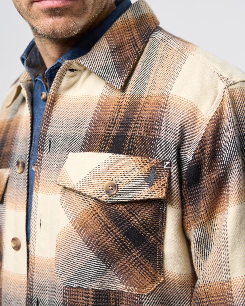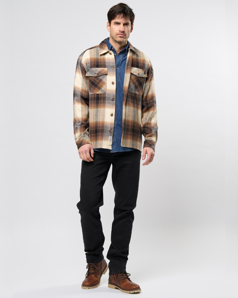 Milo er en kraftig og alsidig flannelskjorte med tydelig workwear-inspiration. Det brunlige ternemønster kombineret med blød kontrastfløjl på krave og lommer skaber et råt, men stilrent udtryk. Perfekt til lag-på-lag og lige så god som overshirt som alene.